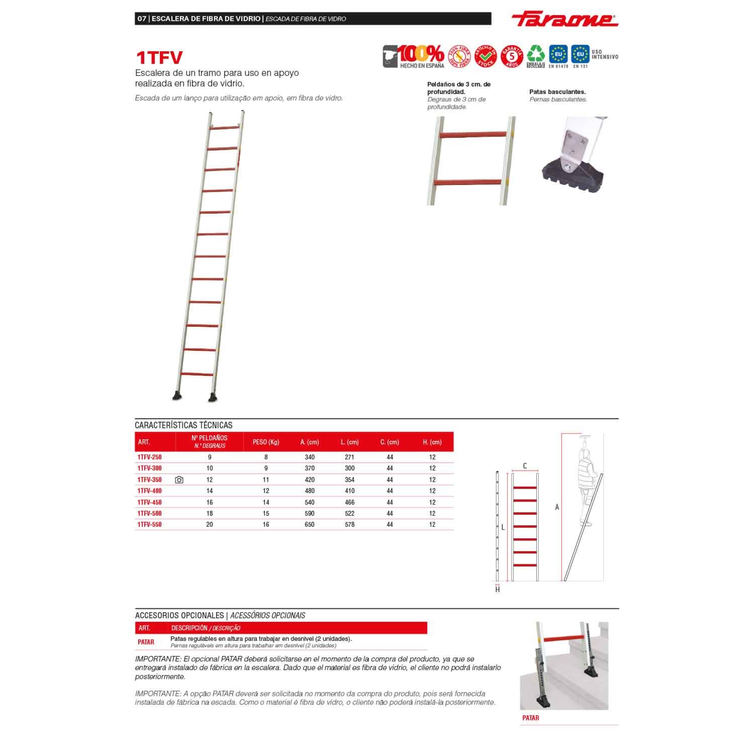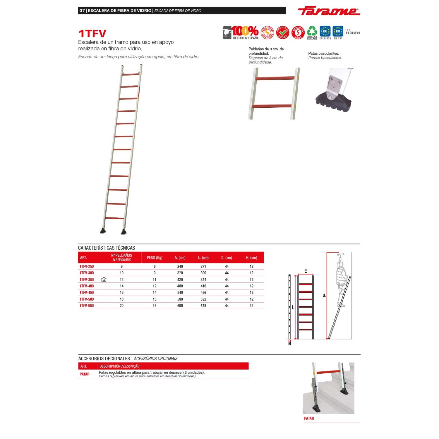 A escada 1TFV é composta por lanços em fibra de vidro e equipada com pés giratórios para facilitar a deslocação; ideal para trabalhos com riscos elétricos.