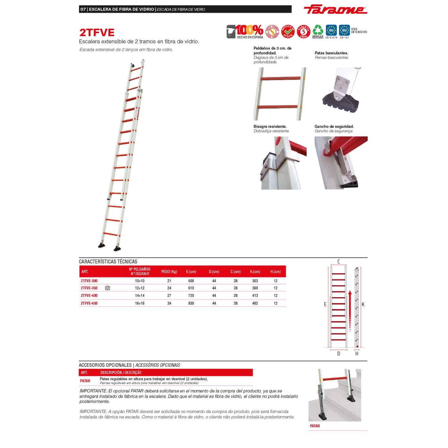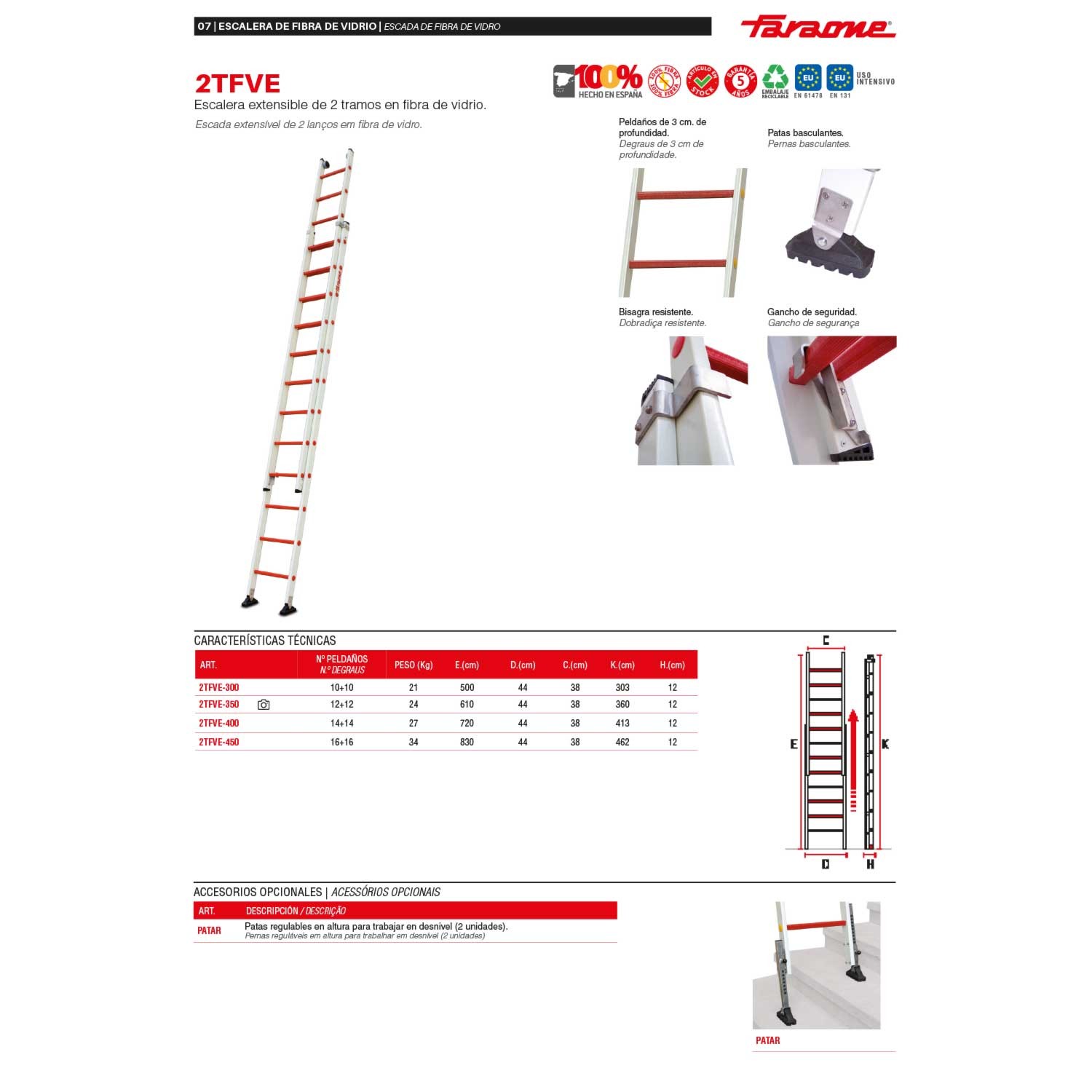 A escada 2TFVE é composta por 2 lanços em fibra de vidro, concebida para trabalhar em posição estendida, podendo ser ajustada para atingir várias alturas e equipada com pés basculantes para facilitar a deslocação.
