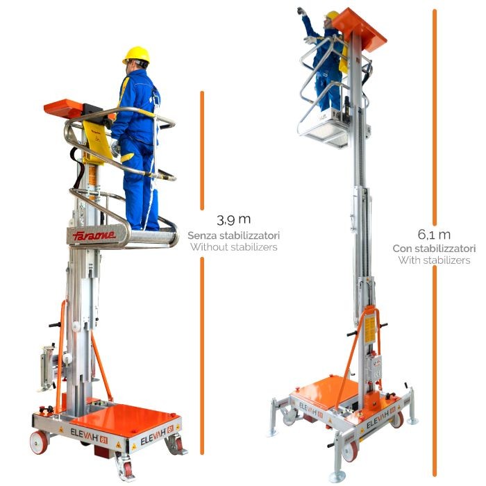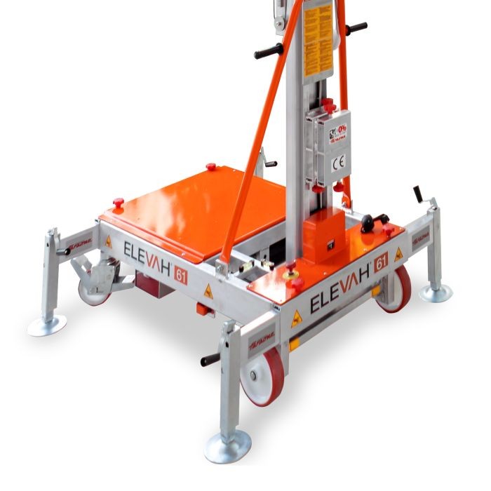 A Elevah 61 é uma plataforma de tração manual e elevação elétrica, inteiramente em alumínio, que permite levantar um operador e efetuar operações de manutenção até um máximo de 6,1 m (com estabilizadores; 3,9 m sem estabilizadores).