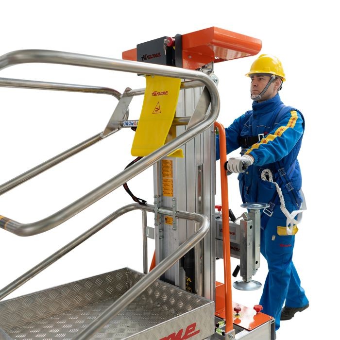 A plataforma é ideal para otimizar o trabalho e o tempo: basta posicionar a máquina, travar as rodas e acionar o botão para atingir a altura desejada. Está também equipada com uma prática prateleira que permite colocar ferramentas até um máximo de 20 kg.
