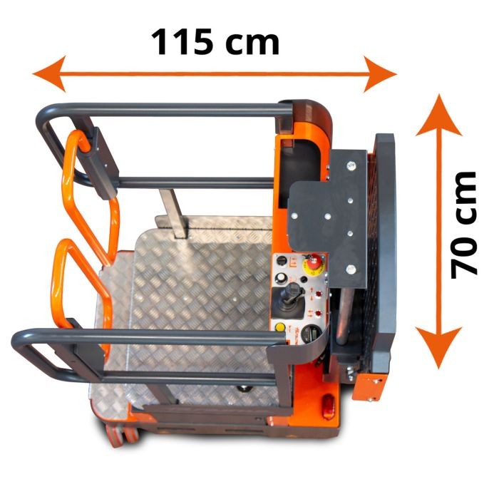 É muito fácil de manobrar graças ao seu prático joystick, que permite a operação com uma só mão. Além disso, graças ao raio de viragem zero, a plataforma gira 360°, simplificando a movimentação mesmo nos locais mais difíceis.