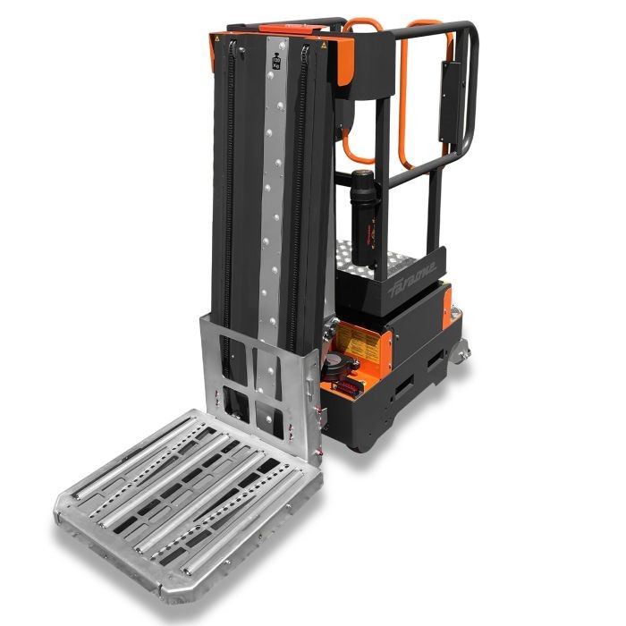 Esta máquina permite trabalhar com segurança até 5,15 m, otimizando o tempo e reduzindo o esforço. Foi concebida para carregar até 120 kg diretamente do chão e é ajustável eletricamente, permitindo aproximar ou afastar a mercadoria e manter uma posição ergonómica em todas as operações. Conta ainda com práticas roldanas de deslizamento para facilitar as operações de armazenamento.