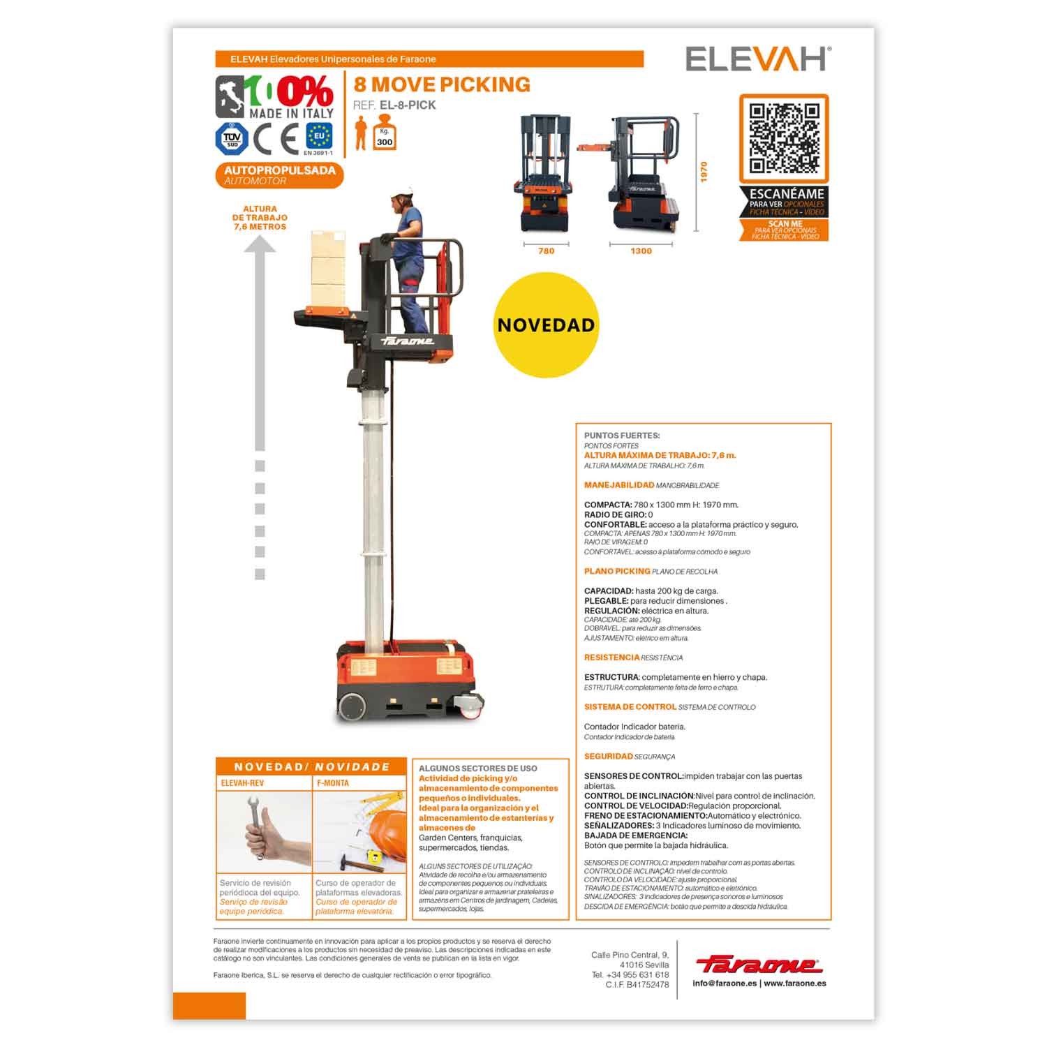 A Elevah 8 Move Picking oferece conforto, ergonomia e segurança nas operações de picking em armazéns. A plataforma de picking ajustável e dobrável reduz o esforço do operador, enquanto o design compacto e versátil permite movimentar-se facilmente entre prateleiras e corredores estreitos, garantindo rapidez e precisão.