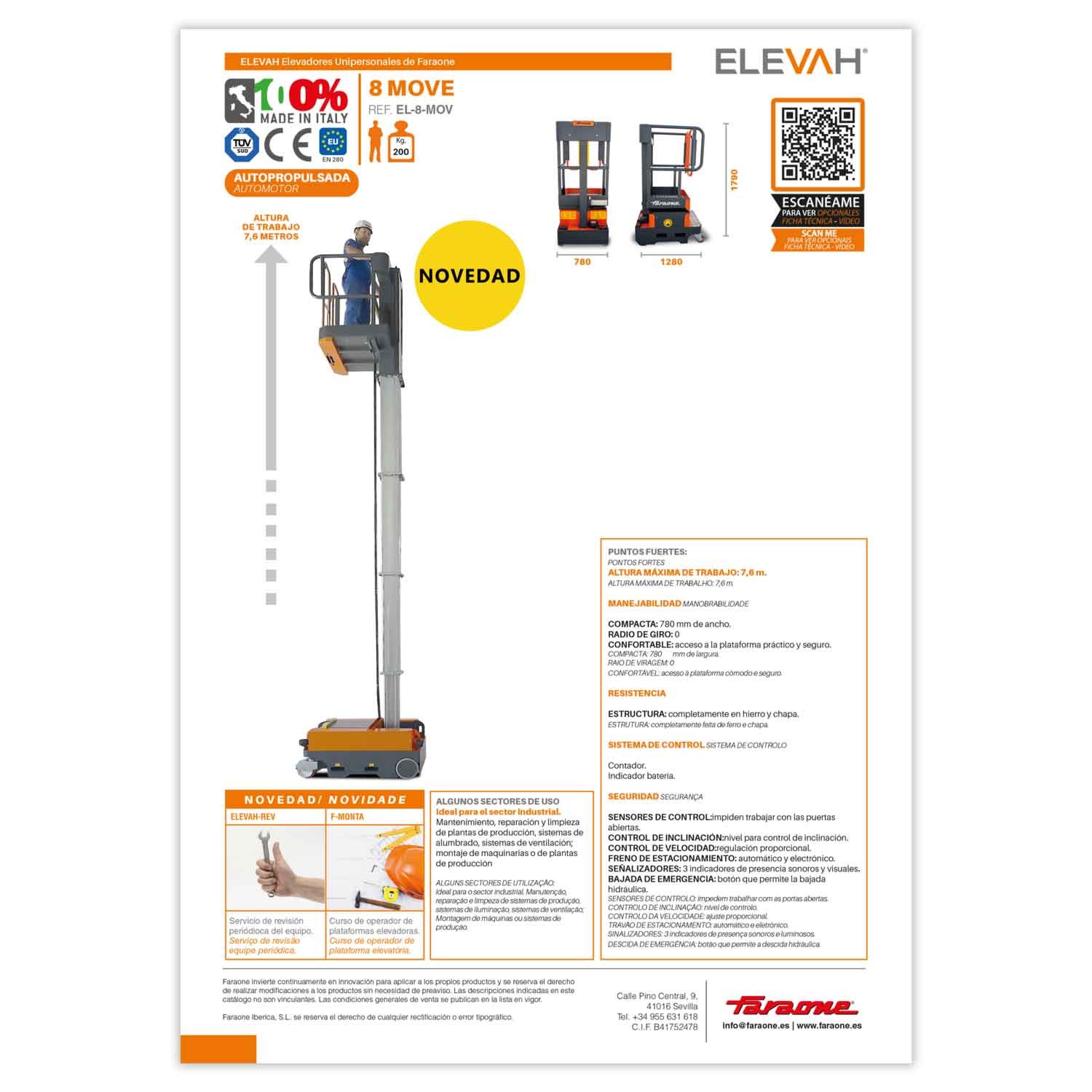 A Elevah 8 Move é uma plataforma autopropulsada compacta de nova geração, projetada para garantir máxima segurança, robustez e facilidade de uso. Com uma altura máxima de trabalho de 7,6 metros, capacidade de carga de até 200 kg e peso de 1.020 kg, é perfeita para armazéns, logística, manutenção industrial, centros comerciais, instalações públicas e empresas de serviços. O seu design avançado torna-a ideal para quem procura uma plataforma móvel fiável e de alto desempenho.
