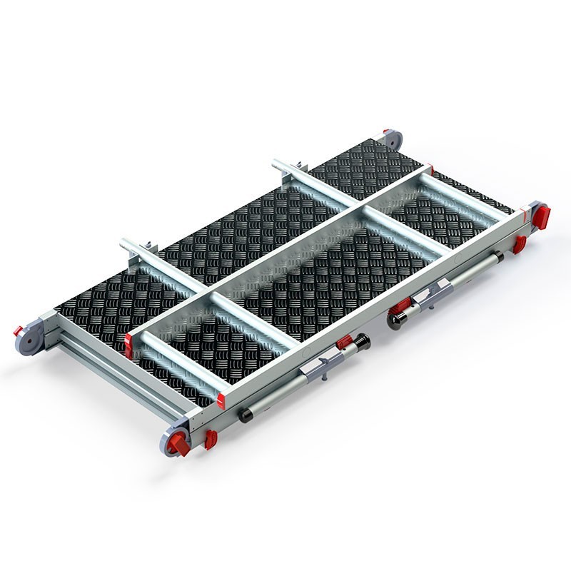 Plataforma telescópica com pés ajustáveis em altura para absorção de desníveis e prático gradil rebatível.