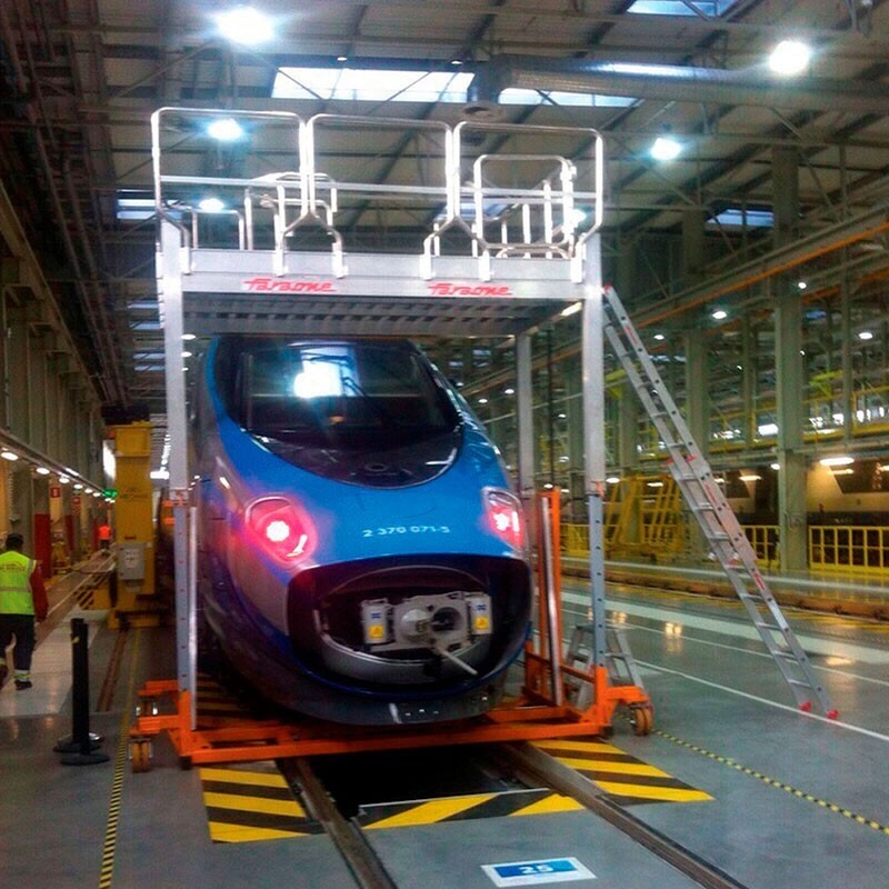 Plataforma ajustável em altura e com distância ao solo para permitir o acesso à parte da frente do comboio (janela, faróis, etc.).