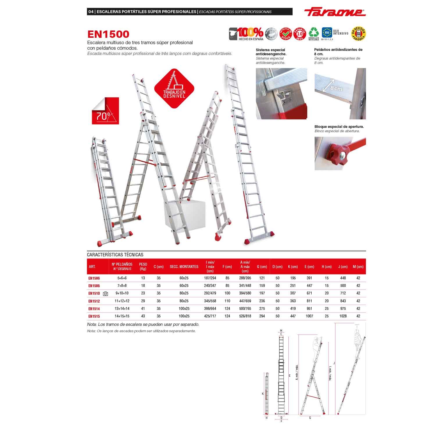 Possui duas rodas na extremidade para facilitar a extensão na parede, dobradiça robusta que permite nivelar o lanço para trabalhar em terrenos irregulares e um fecho de segurança com um prático e seguro gancho de mola.