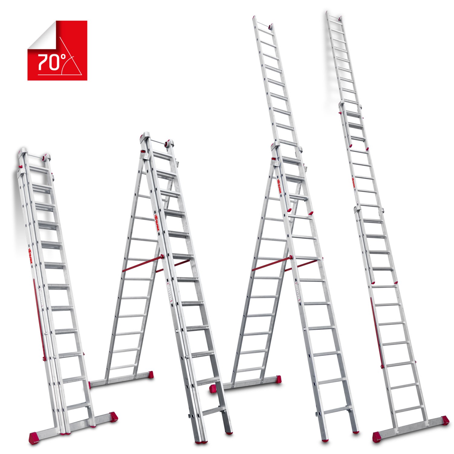 Ao ser uma escada multiusos combinada, pode ser utilizada como escada de tesoura com dupla subida. Os três lanços podem ser estendidos e utilizados como escada de apoio na parede. Também pode ser colocada em terrenos irregulares, o que a torna adequada para tarefas em pisos como passeios ou escadas.