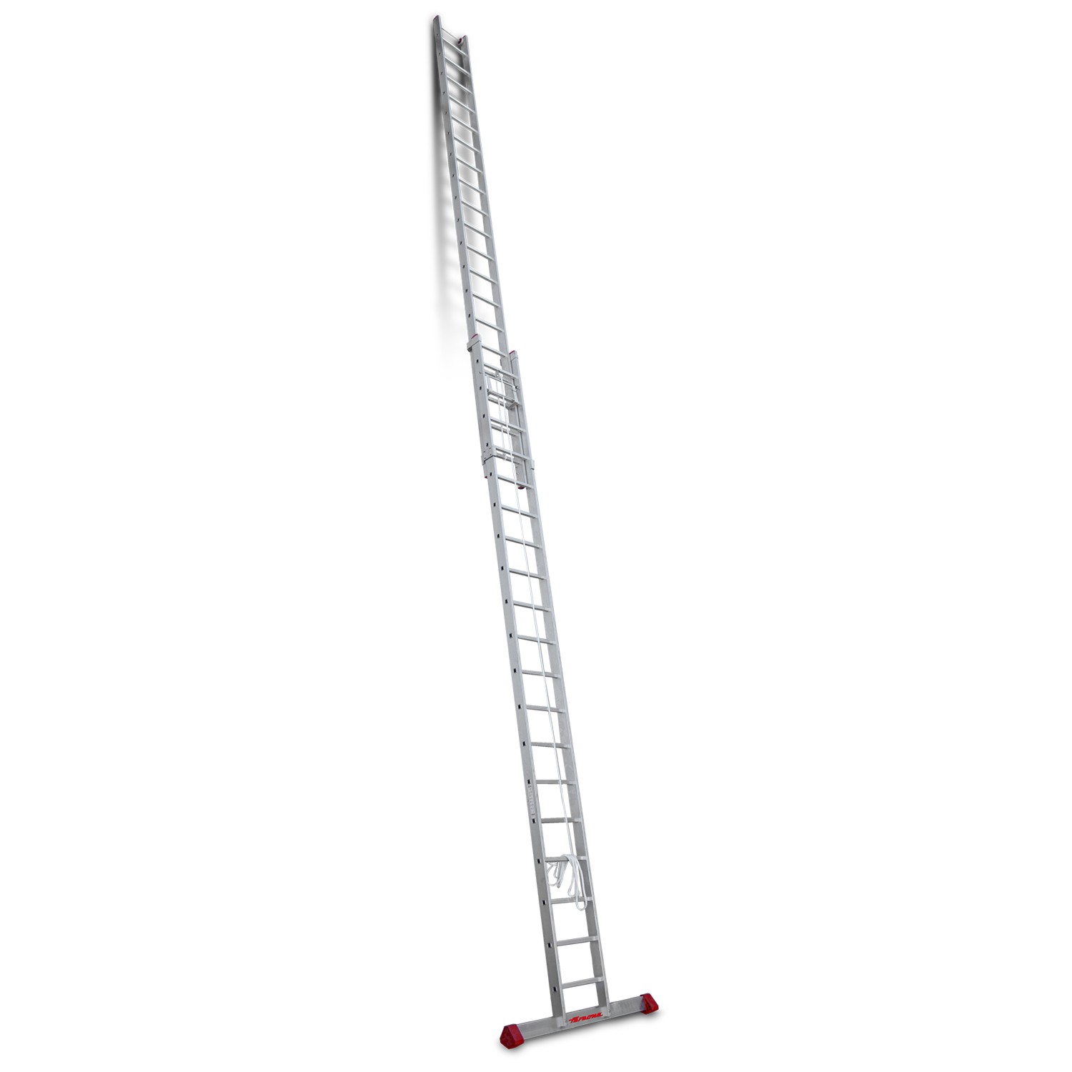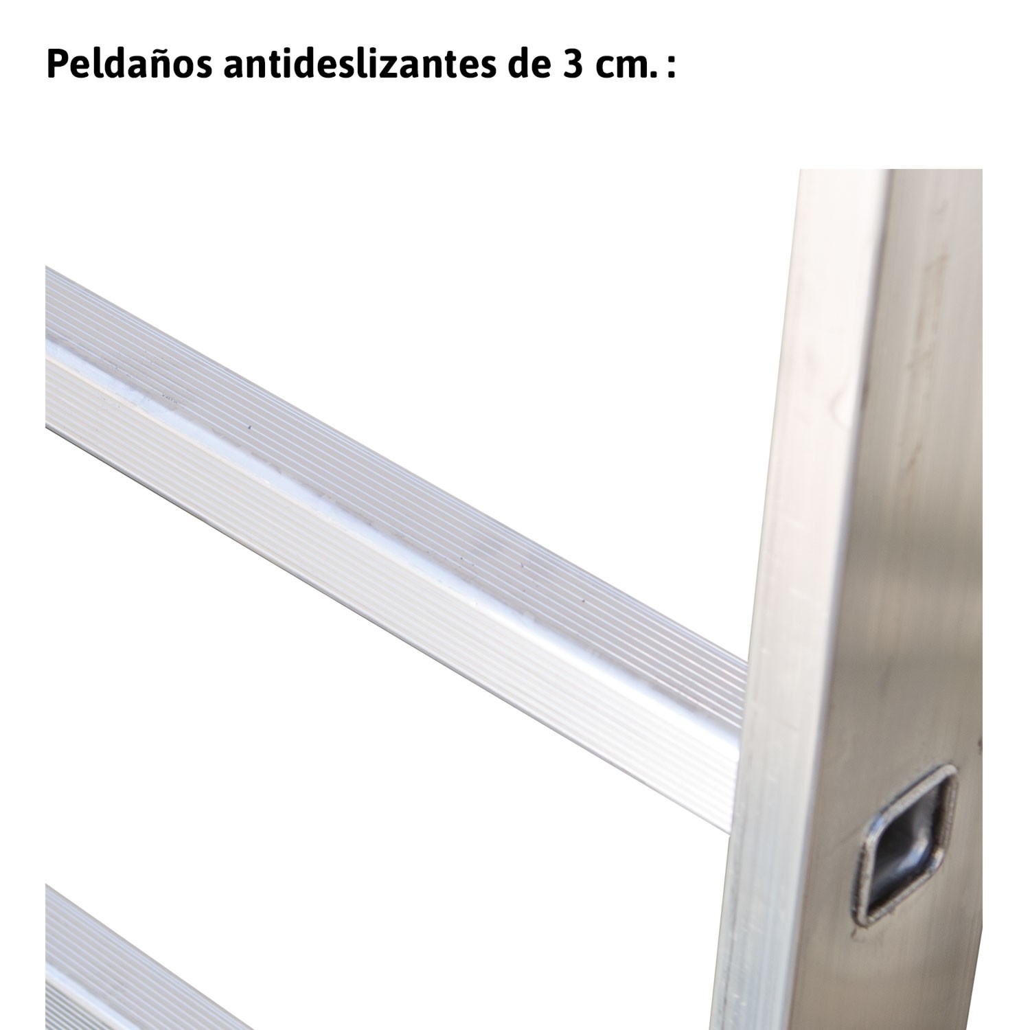 A escada EN200 é fabricada em alumínio com dois lanços que se articulam através de um sistema de roldanas acionado por uma corda, base estabilizadora com calços de alta aderência, rodas superiores para garantir o apoio e a aderência à parede e degraus de 3 cm.