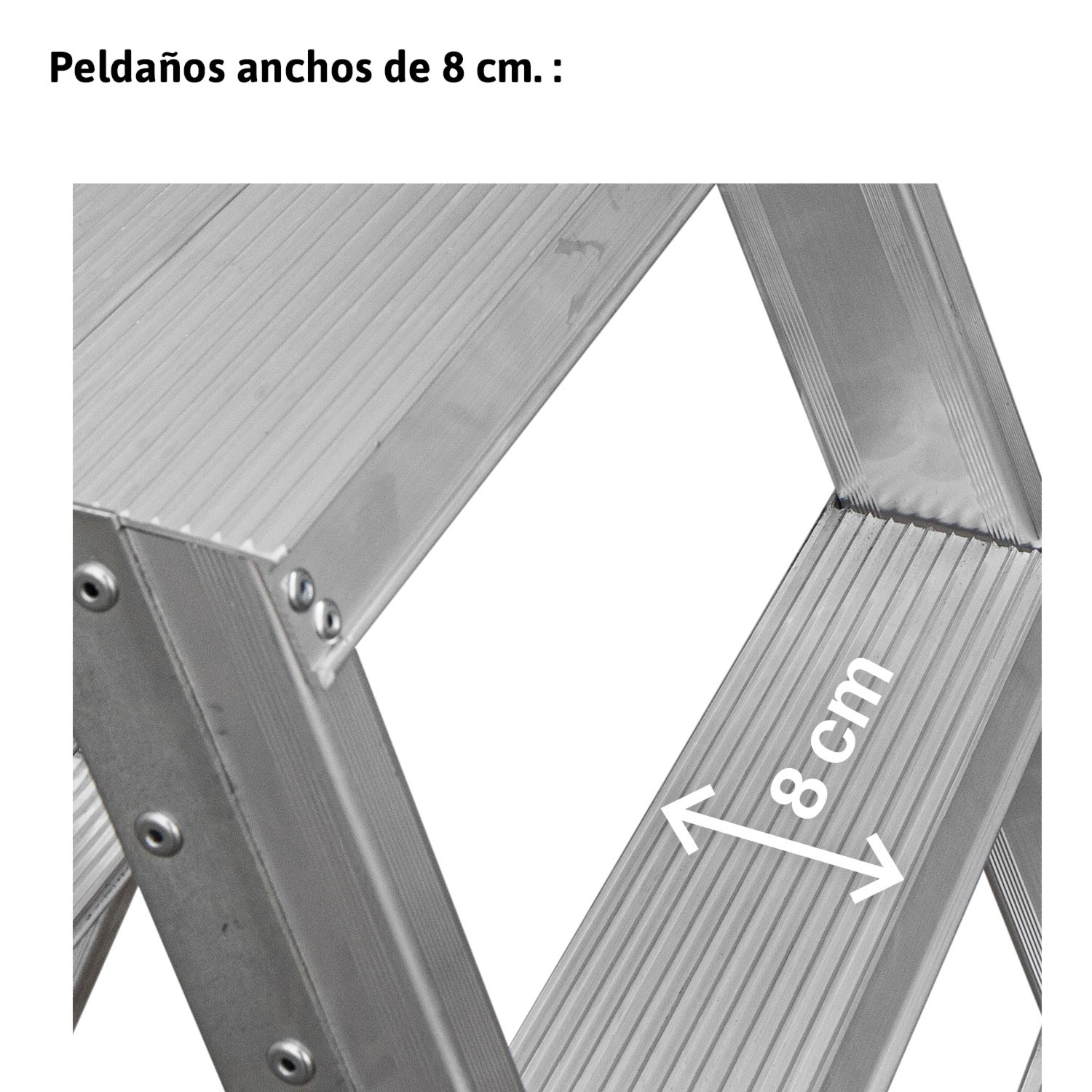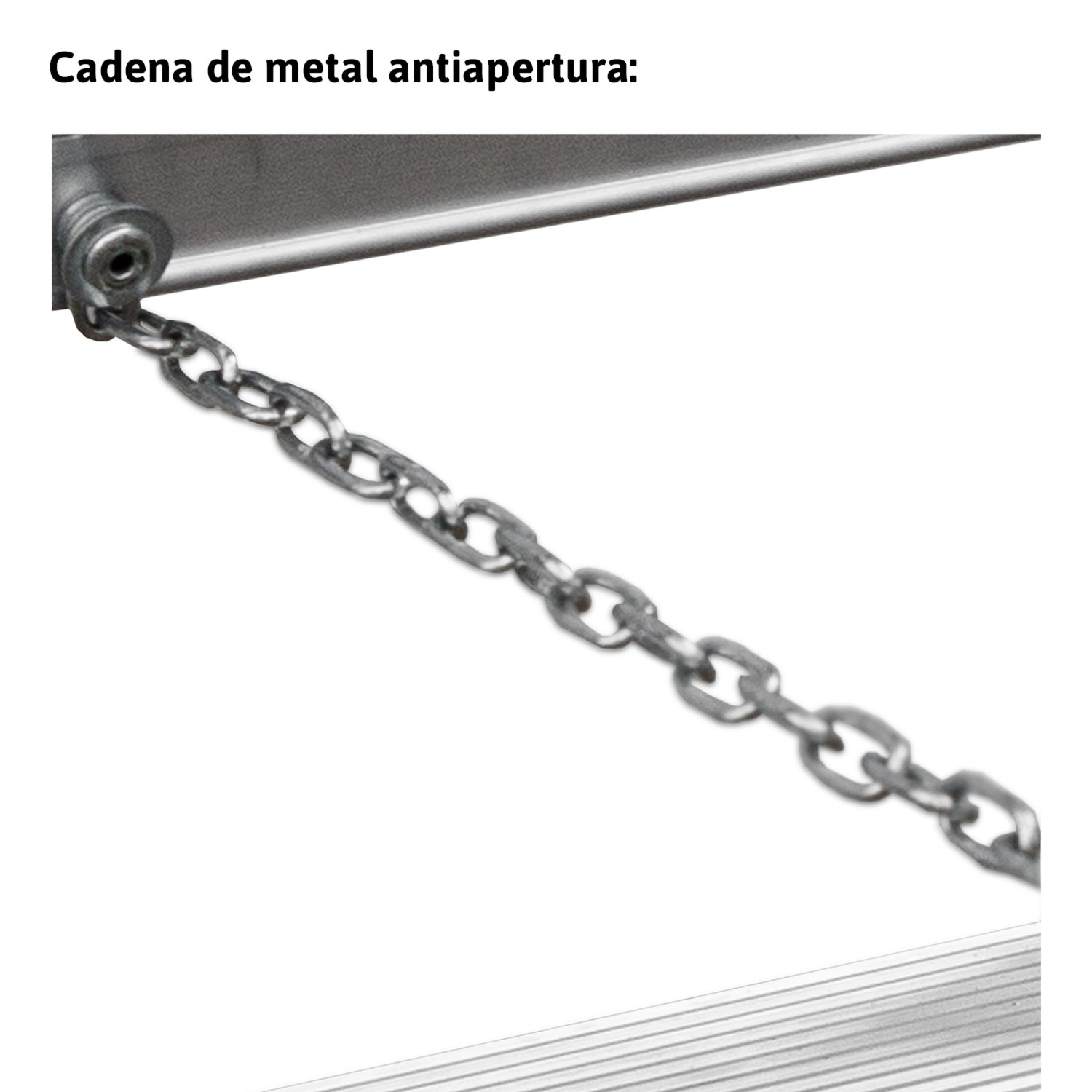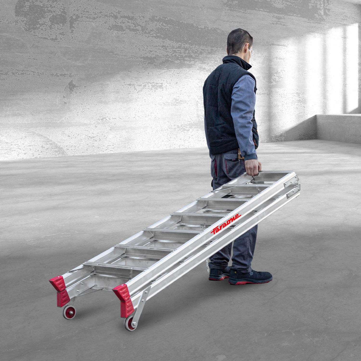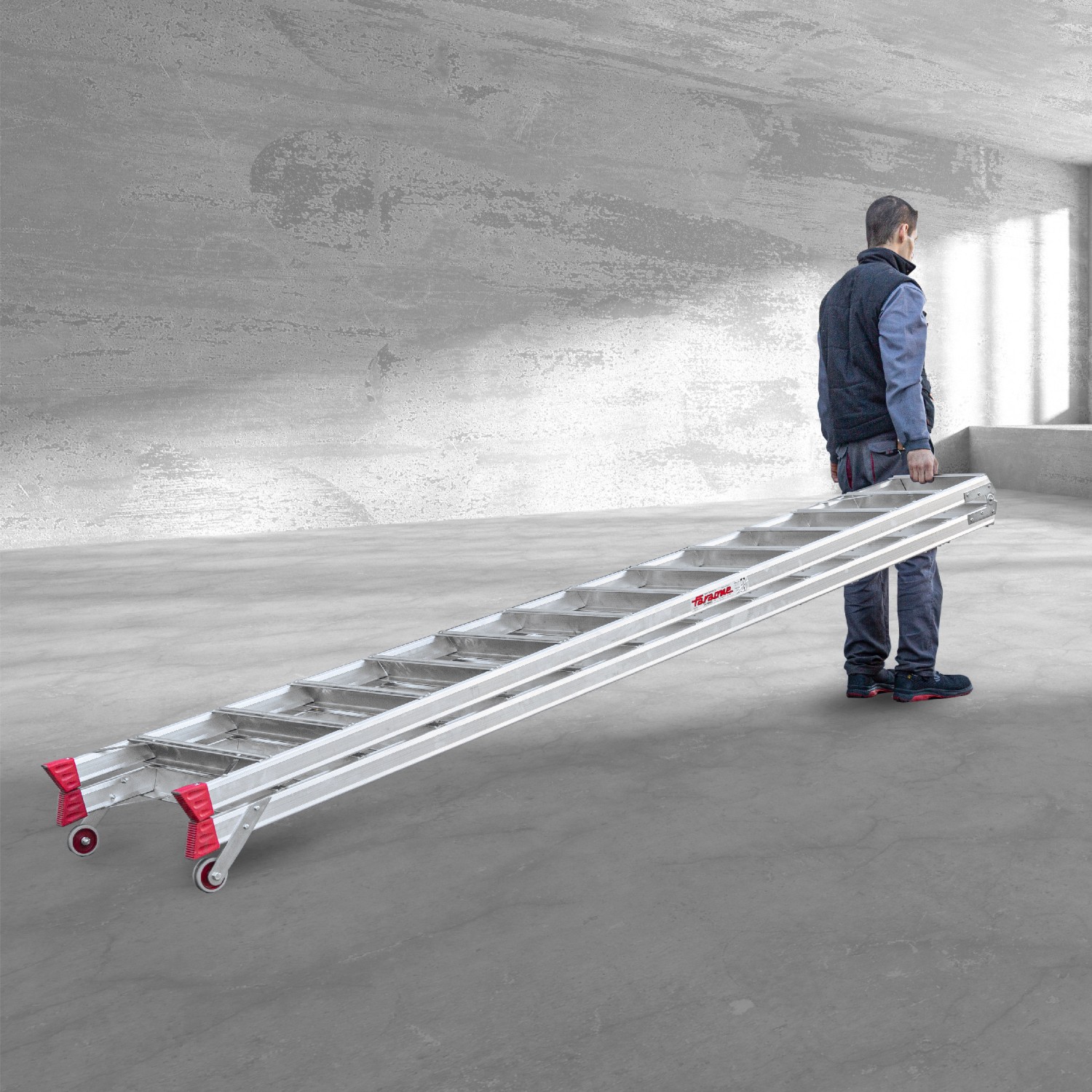A escada NDS é fabricada em alumínio, possui um sistema de dobradiças rígido e resistente entre os dois lanços de subida, um sistema antifecho seguro, degraus de 8 cm e grandes calços de borracha com grande aderência à superfície.