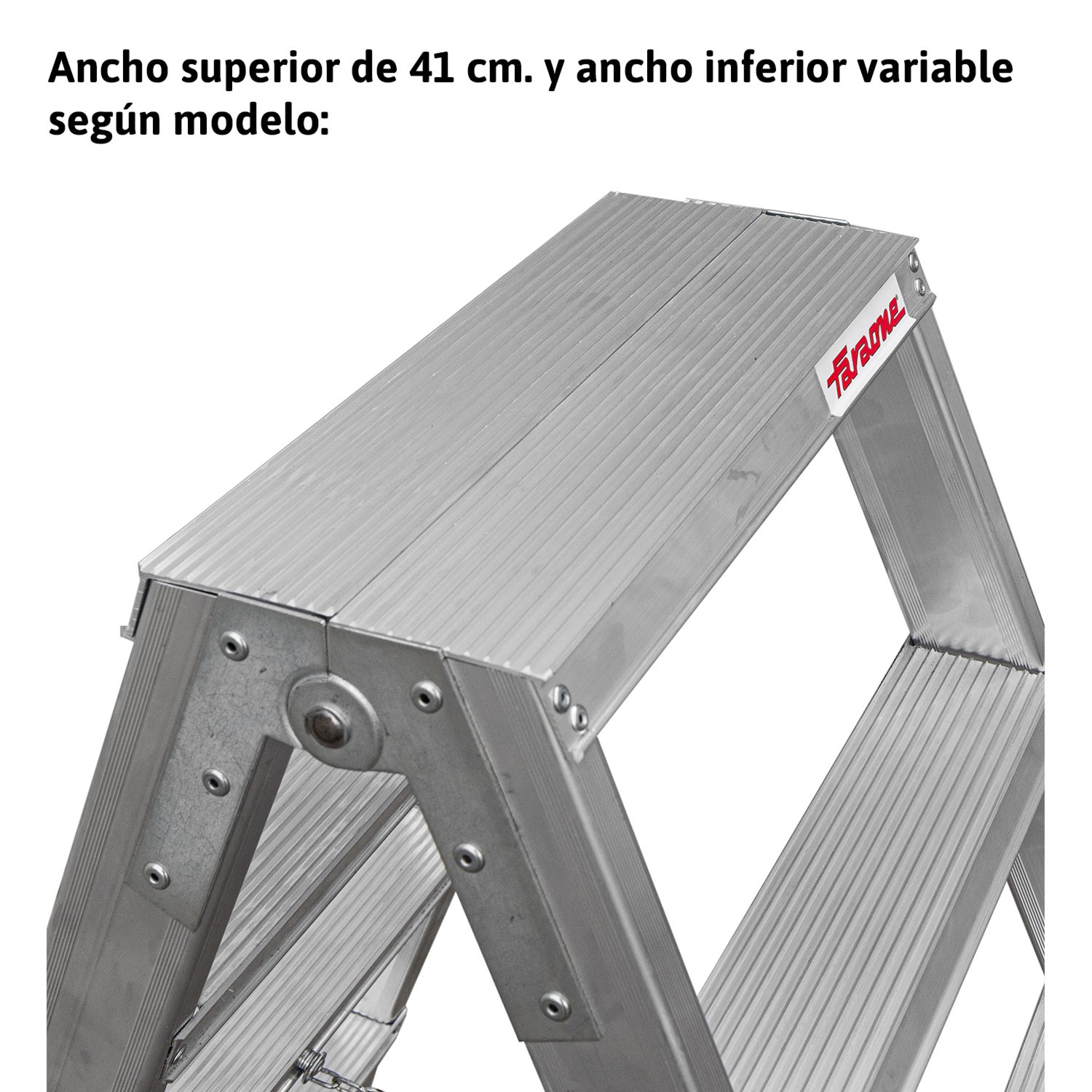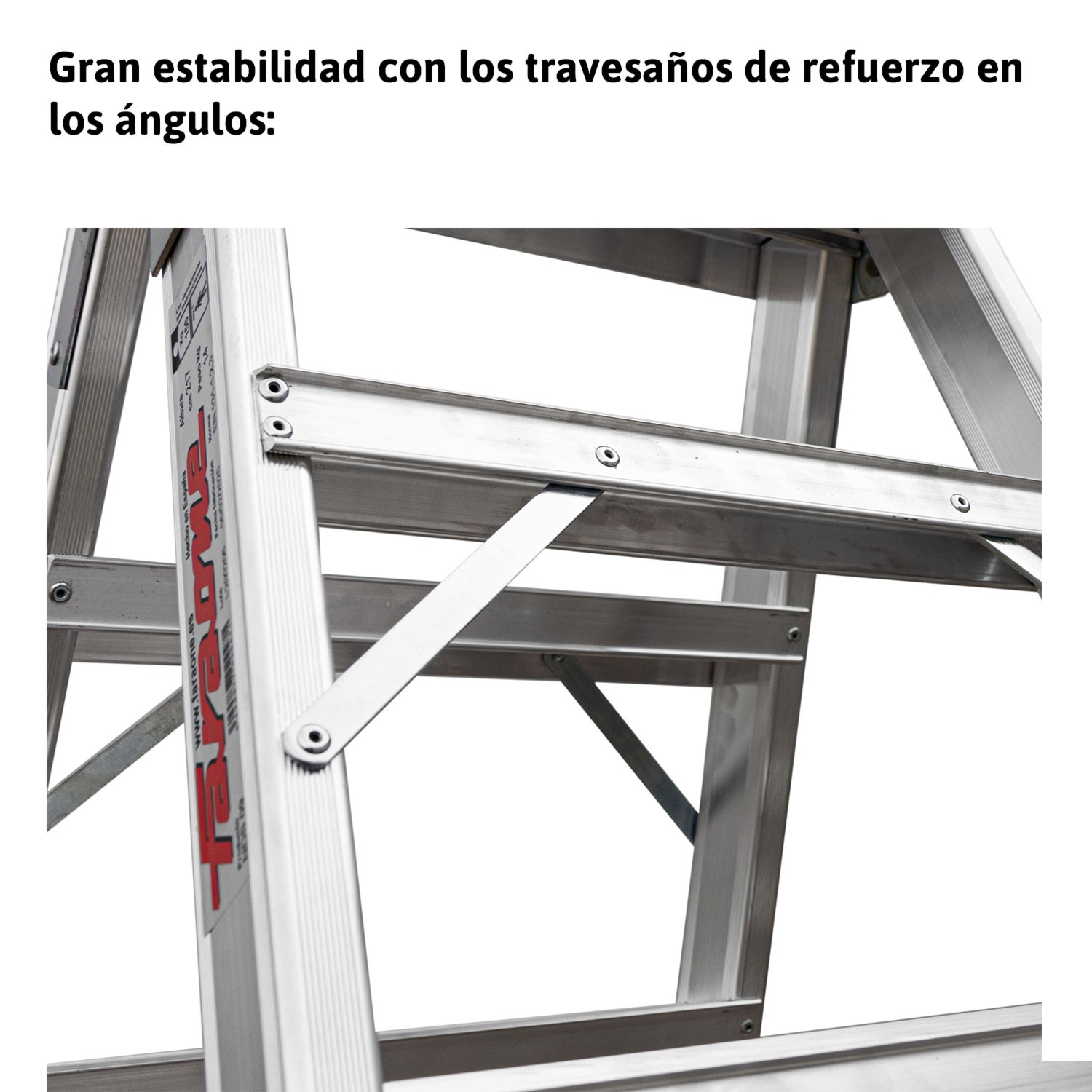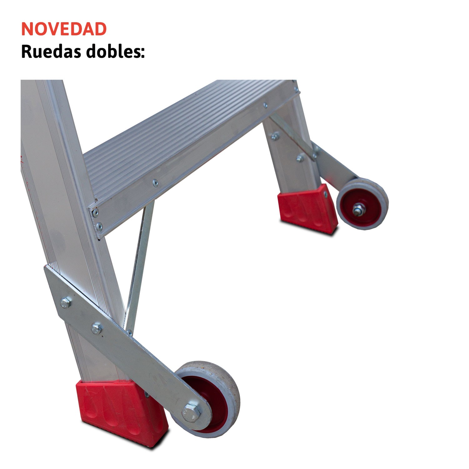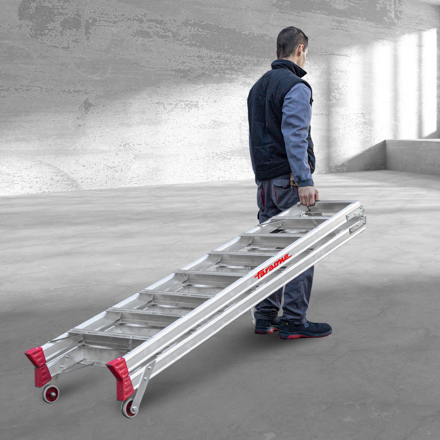 A escada NDS é fabricada em alumínio, possui um sistema de dobradiças rígido e resistente entre os dois lanços de subida, um sistema antifecho seguro, degraus de 8 cm e grandes calços de borracha com grande aderência à superfície.