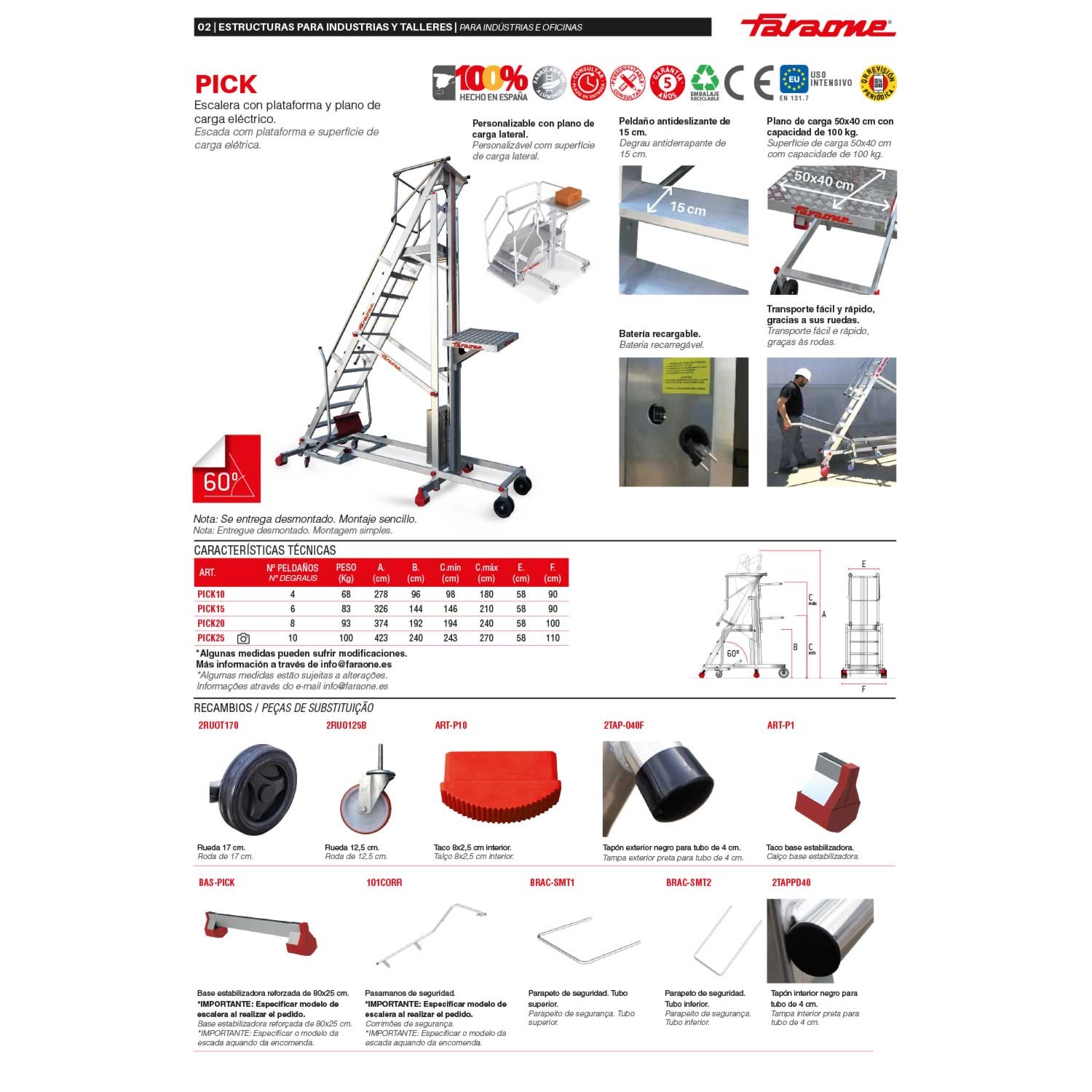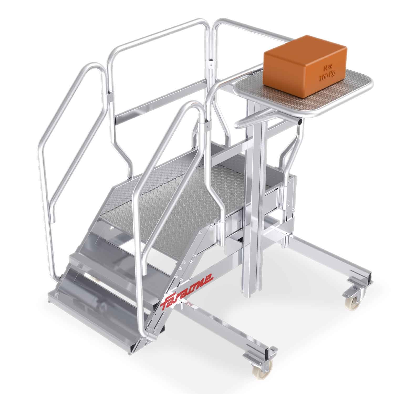 A escada PICK é fabricada em alumínio e está equipada com uma plataforma de trabalho e uma superfície elevatória de acionamento elétrico. Foi concebida para indústrias, oficinas e armazéns, uma vez que a plataforma permite trabalhos em altura e a superfície de trabalho com acionamento elétrico permite elevar pacotes e embalagens e armazená-los em estantes.