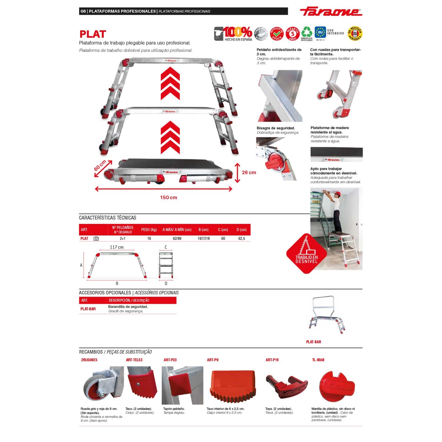 A PLAT é uma plataforma de trabalho dobrável com rodas e ampla superfície de trabalho feita de uma madeira especial à prova de água. A principal vantagem deste modelo de plataforma é o facto de poder ser ajustada em altura, permitindo trabalhar em segurança mesmo em pisos que não estejam perfeitamente nivelados, como passeios ou escadarias.