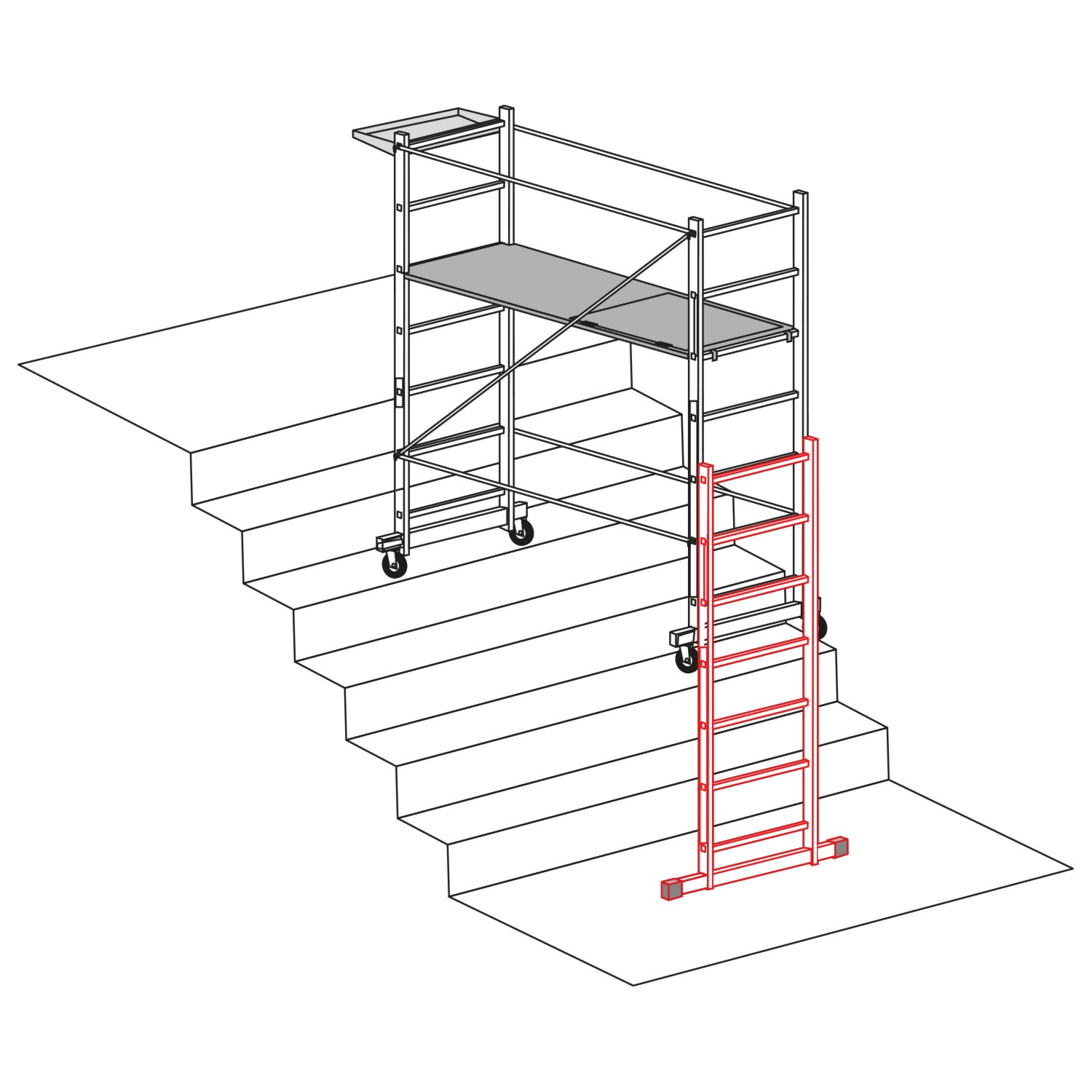 É composto por um lanço de 7 degraus em alumínio e base estabilizadora com calços de alta aderência. Está equipado com 4 ganchos para fixação ao andaime.