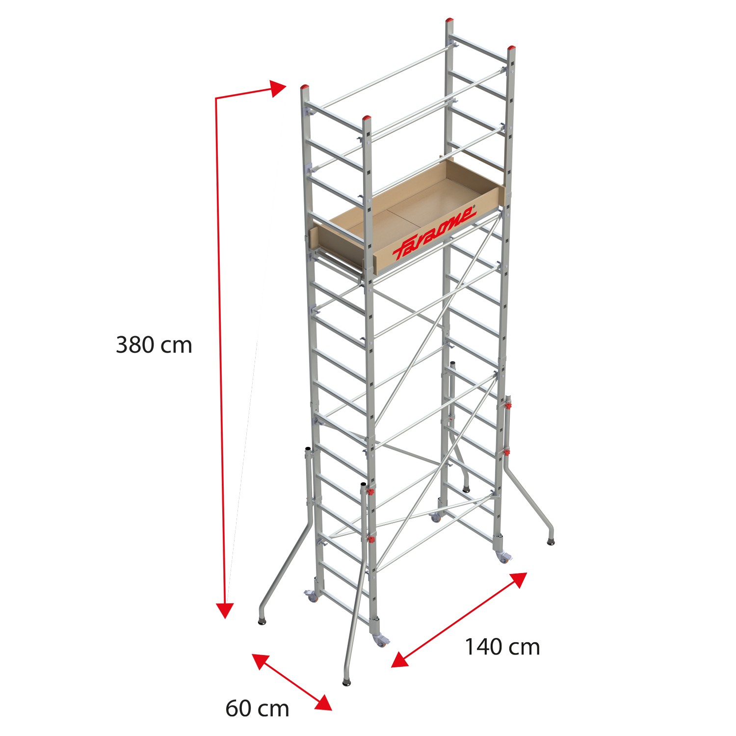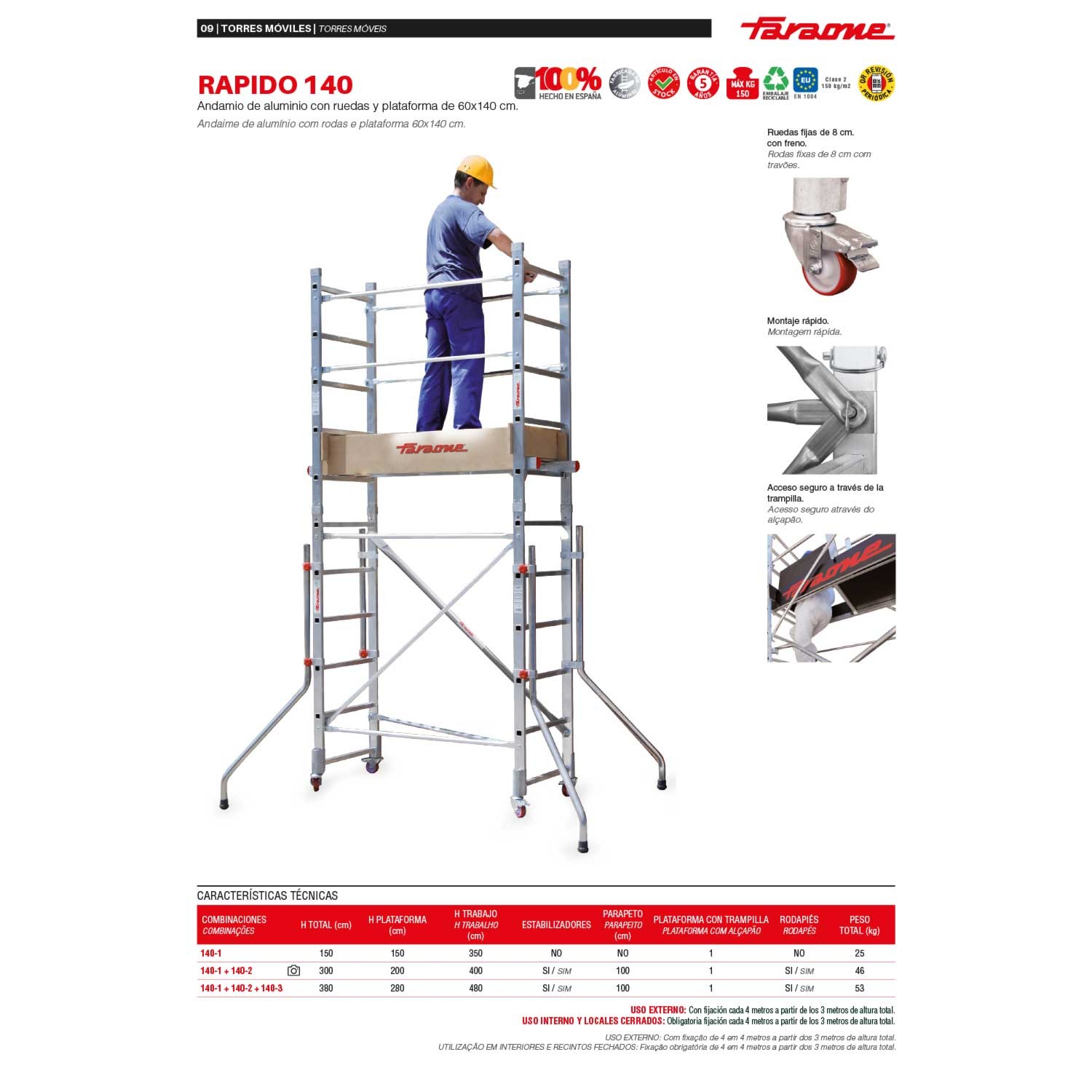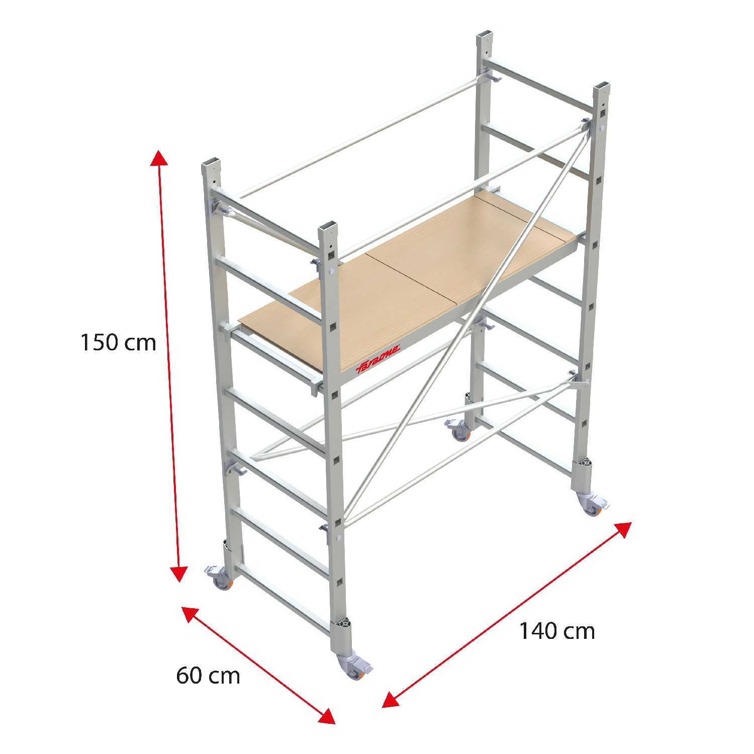 O andaime RAPIDO 140 é fabricado em alumínio, com uma plataforma de madeira com rodapés de 60x140 cm, rodas de 8 cm de diâmetro e travão de pressão e bases estabilizadoras laterais com tampas de alta aderência.