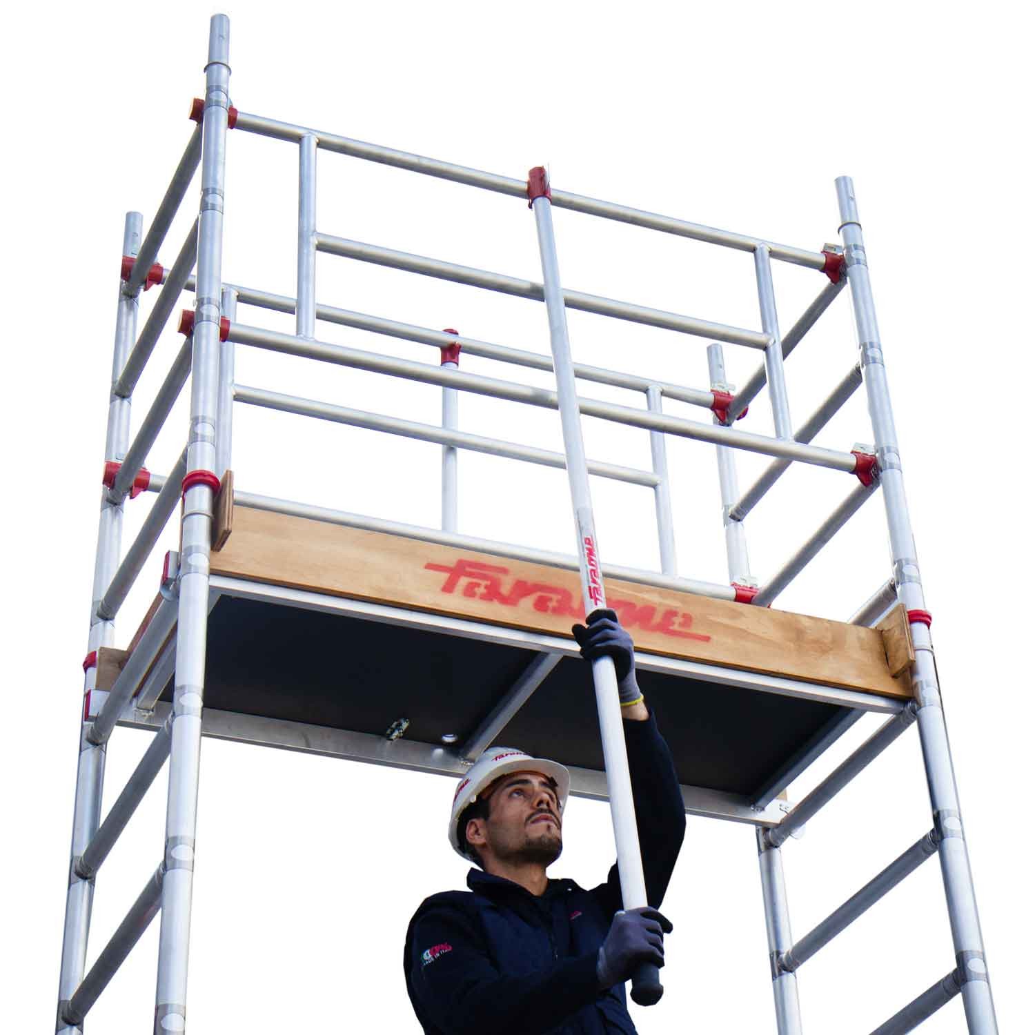 La estabilidad se ve reforzada gracias a las bases estabilizadoras laterales con tapones de alta adherencia, ideales para terrenos irregulares. El sistema modular permite un montaje sencillo y rápido, permitiendo configurar el andamio a la altura de trabajo deseada en poco tiempo.