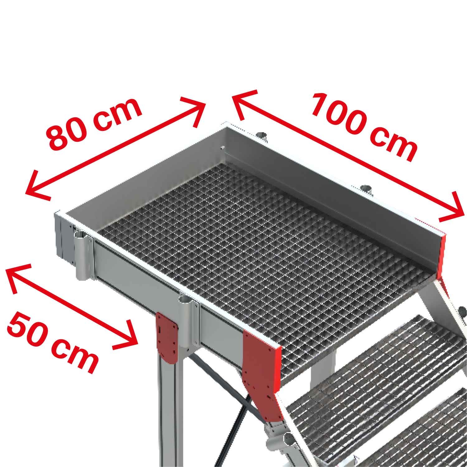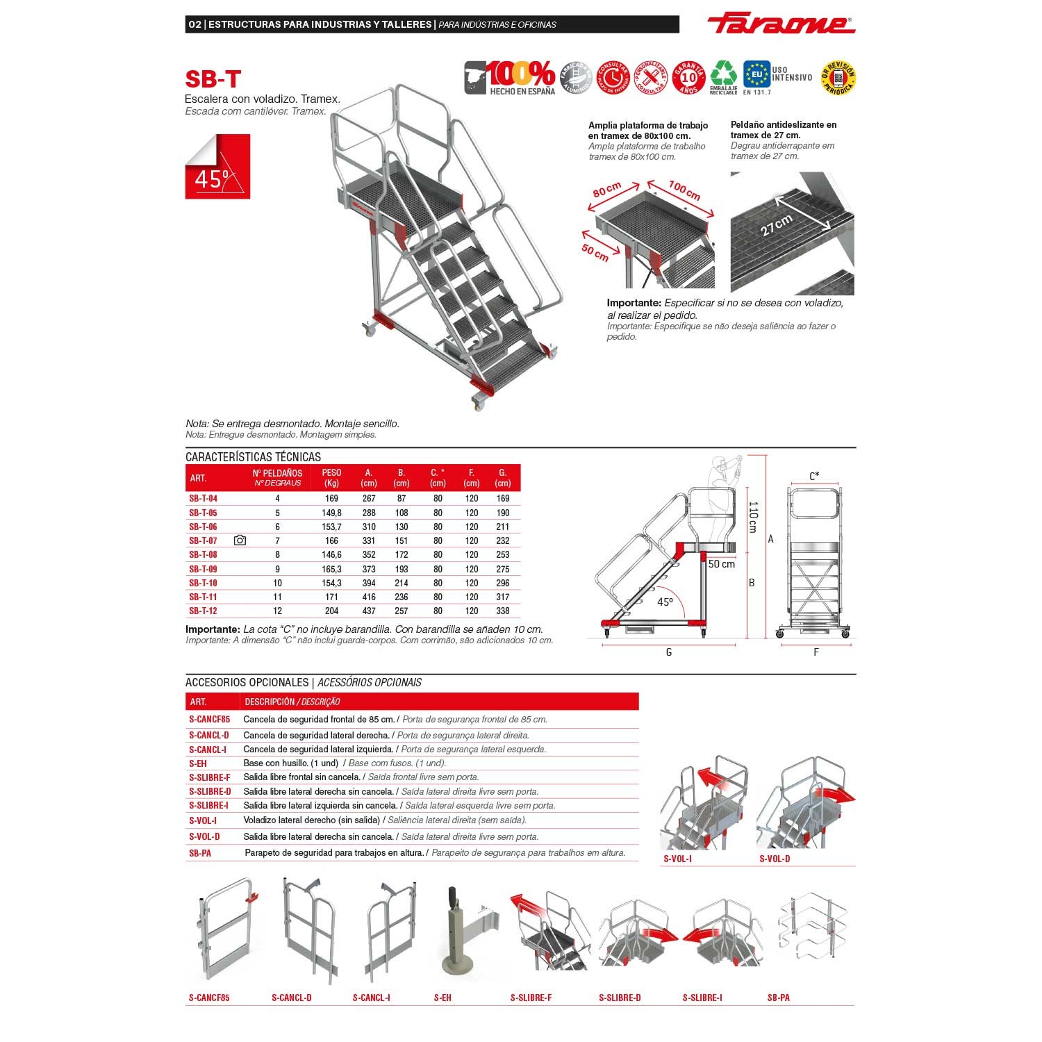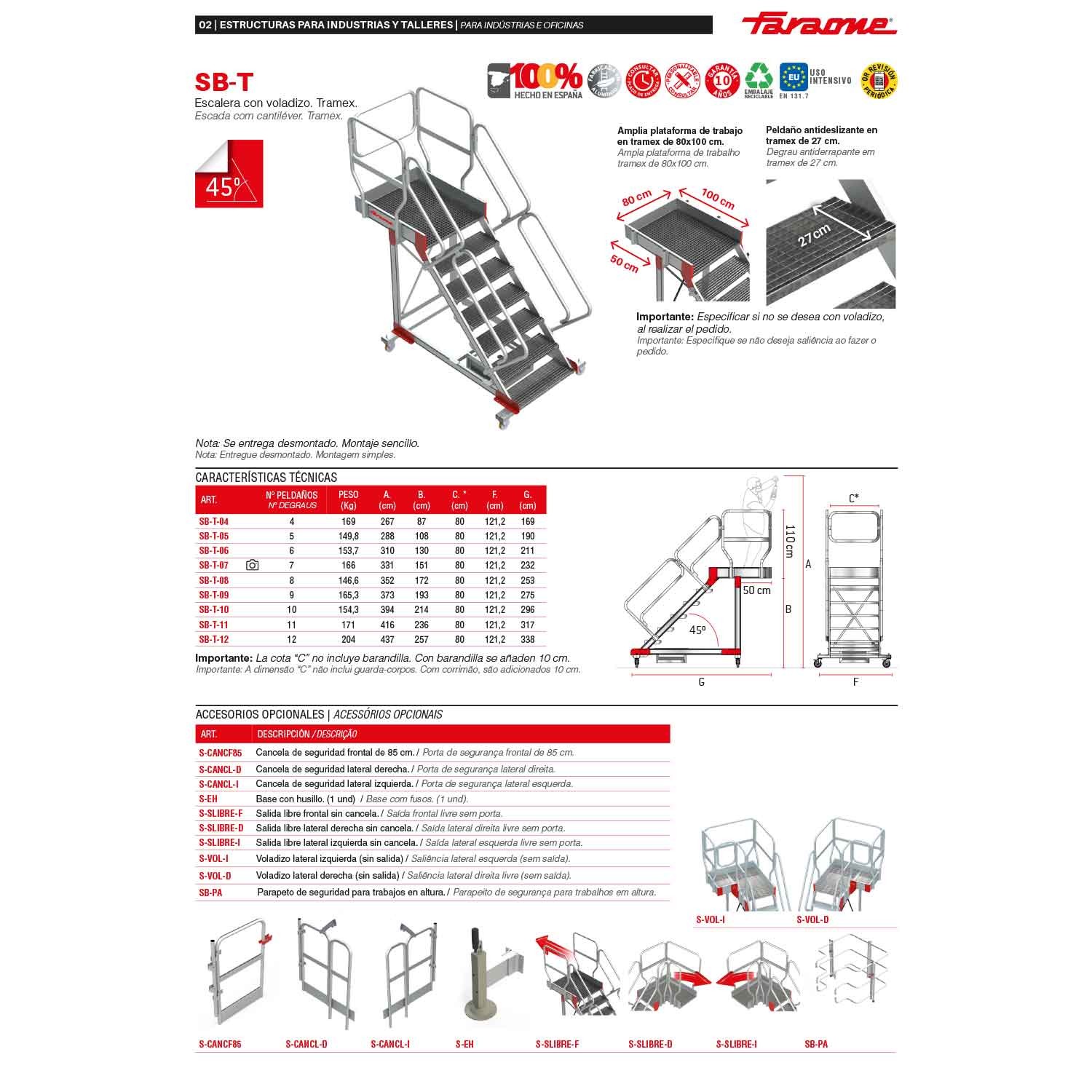 A SB-T é uma escada com rodas e uma ampla superfície de trabalho antiderrapante de 85x100 cm com acesso através de uma escada inclinada a 45° com degraus antiderrapantes de 27 cm de profundidade e corrimão de ambos os lados. A superfície de trabalho inclui rodapés com 24 cm de altura e gradis de segurança com 110 cm nos três lados.