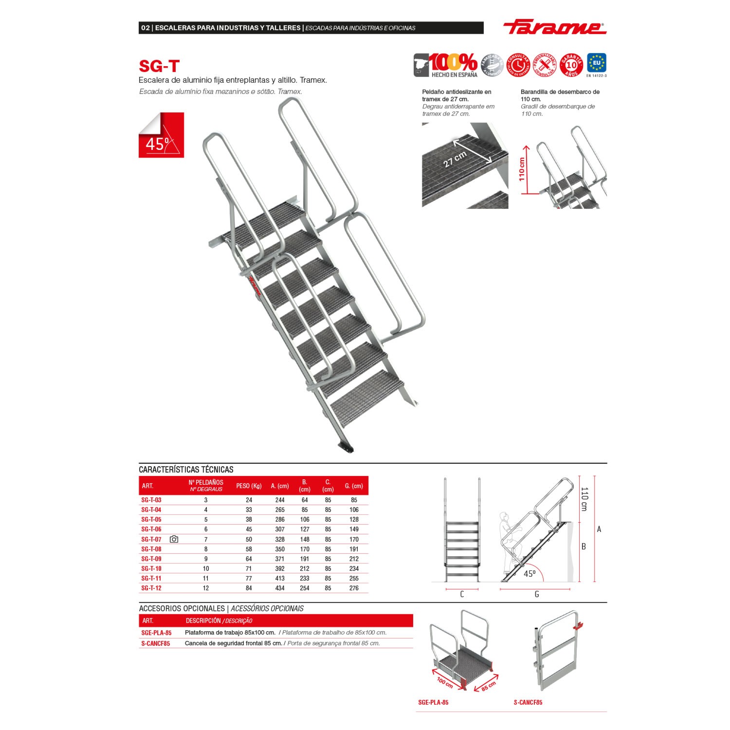 A SG-T é uma escada de alumínio fixada ao solo para um acesso prático e seguro a um mezanino ou sótão de estruturas industriais.