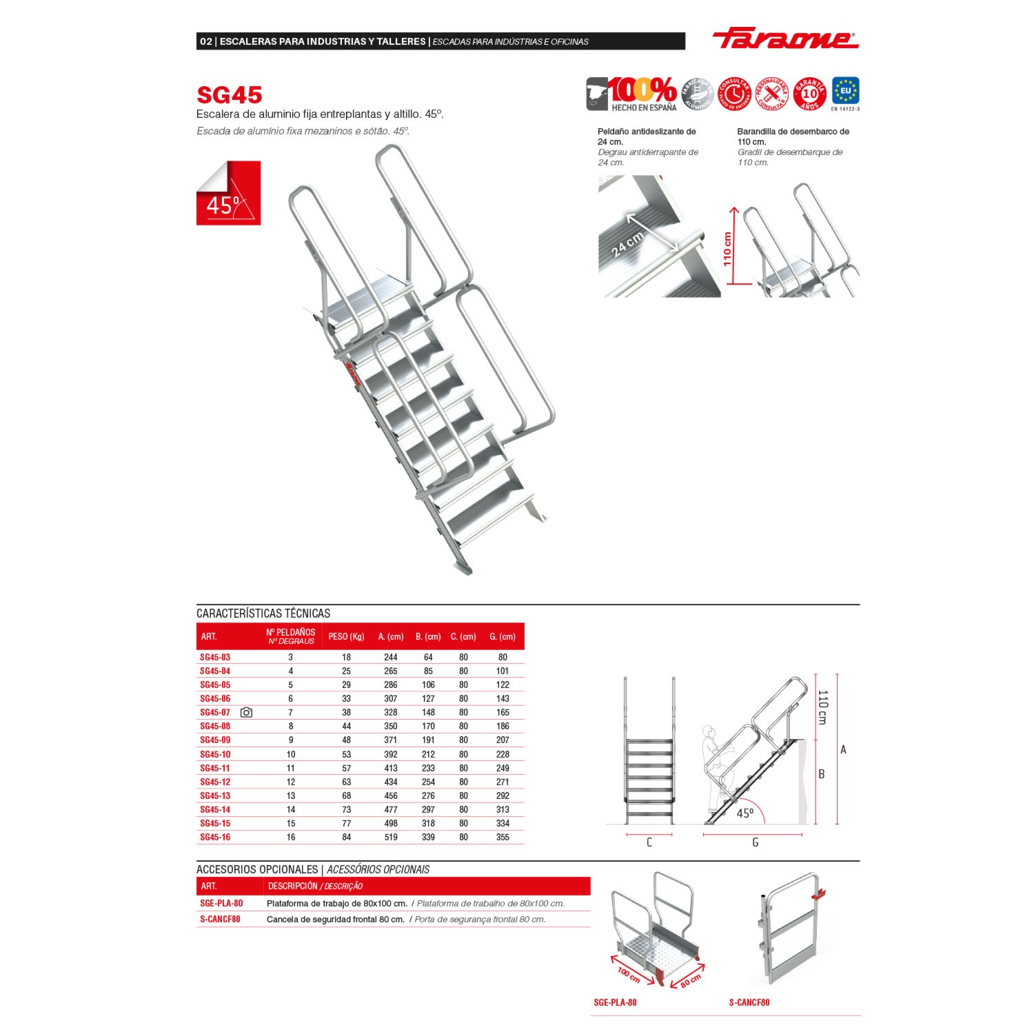 Este produto está em conformidade com a norma europeia EN 14122-3 e é fornecido com o certificado de conformidade e o manual de instruções. A carga máxima que pode suportar é de 150 kg.
