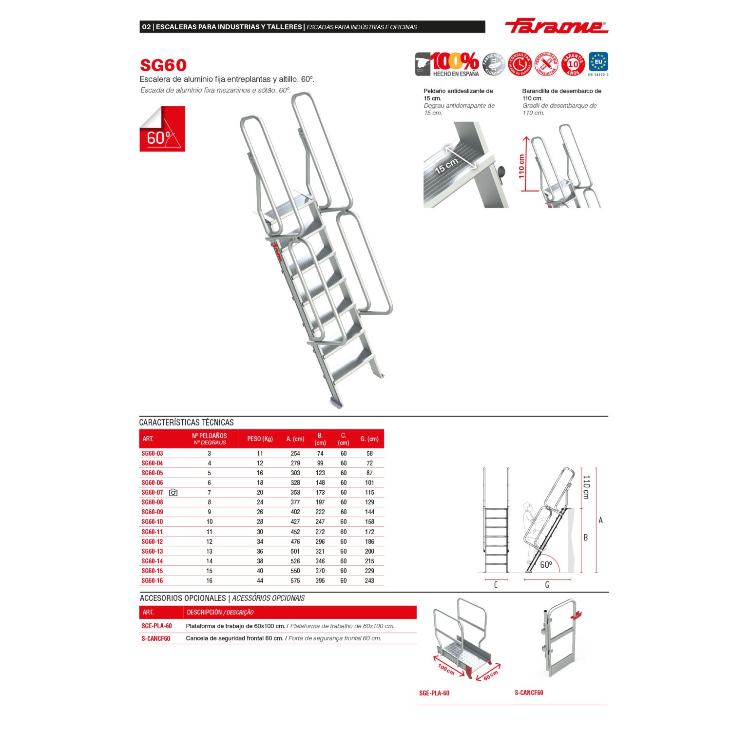 O lanço de subida deste produto está em conformidade com a norma europeia EN 14122-3 e é fornecido juntamente com o certificado de conformidade e o manual de instruções. A carga máxima que pode suportar é de 150 kg.