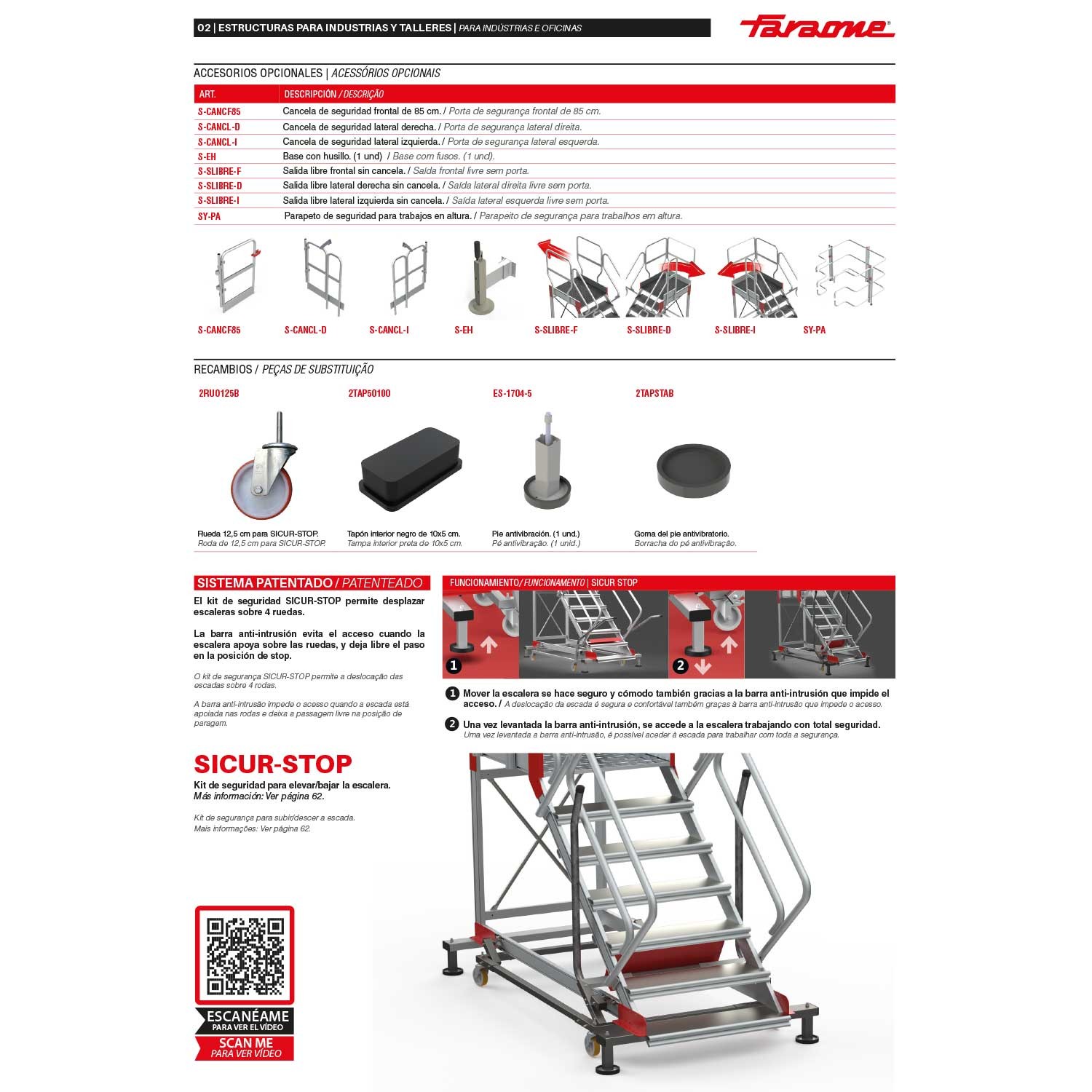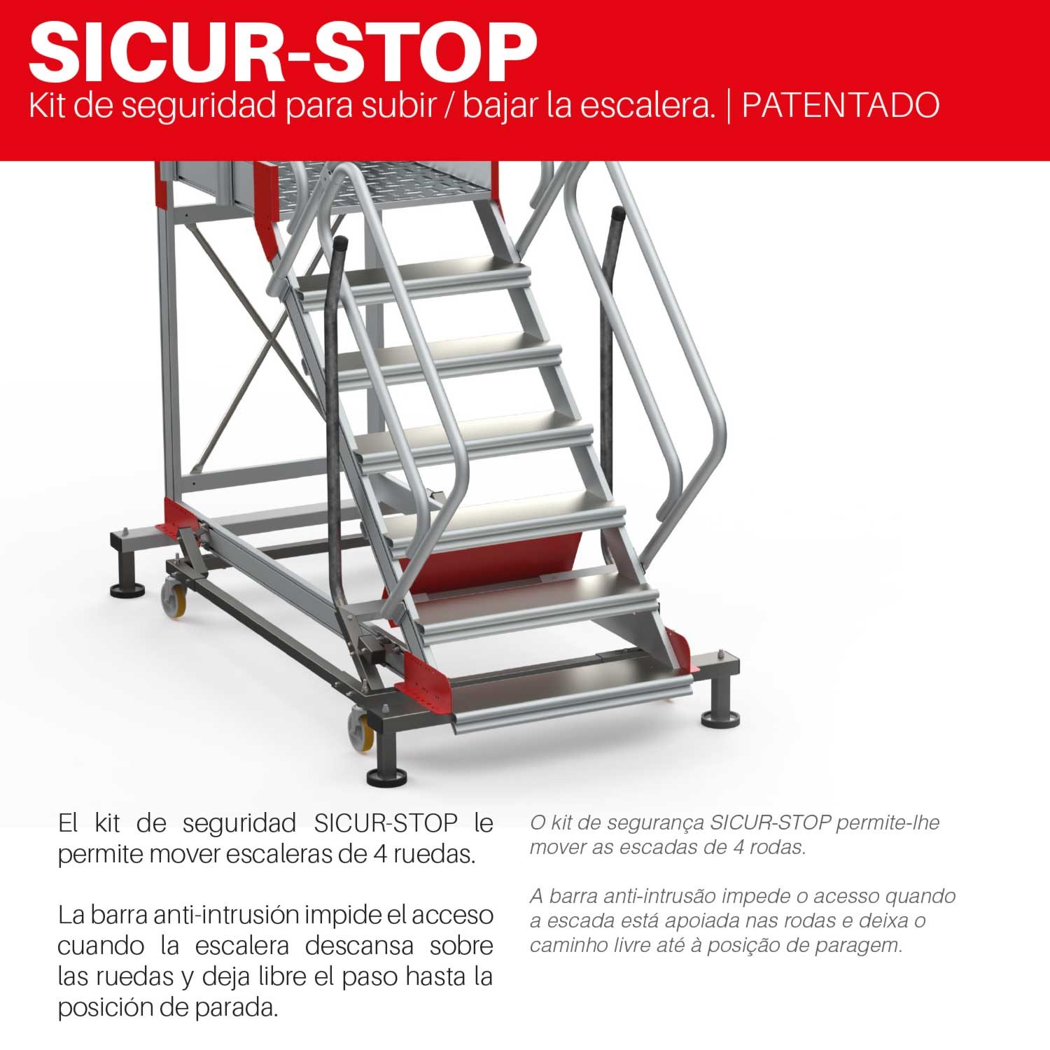 Inclui o sistema SICUR STOP patenteado; kit de segurança que permite deslocar a escada sobre as quatro rodas. A barra anti-intrusão impede o acesso quando a escada está apoiada nas rodas e deixa a passagem livre na posição de paragem "stop".