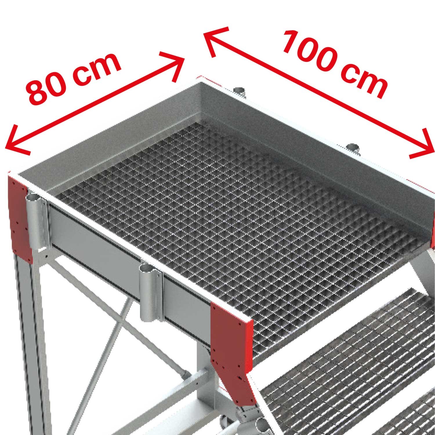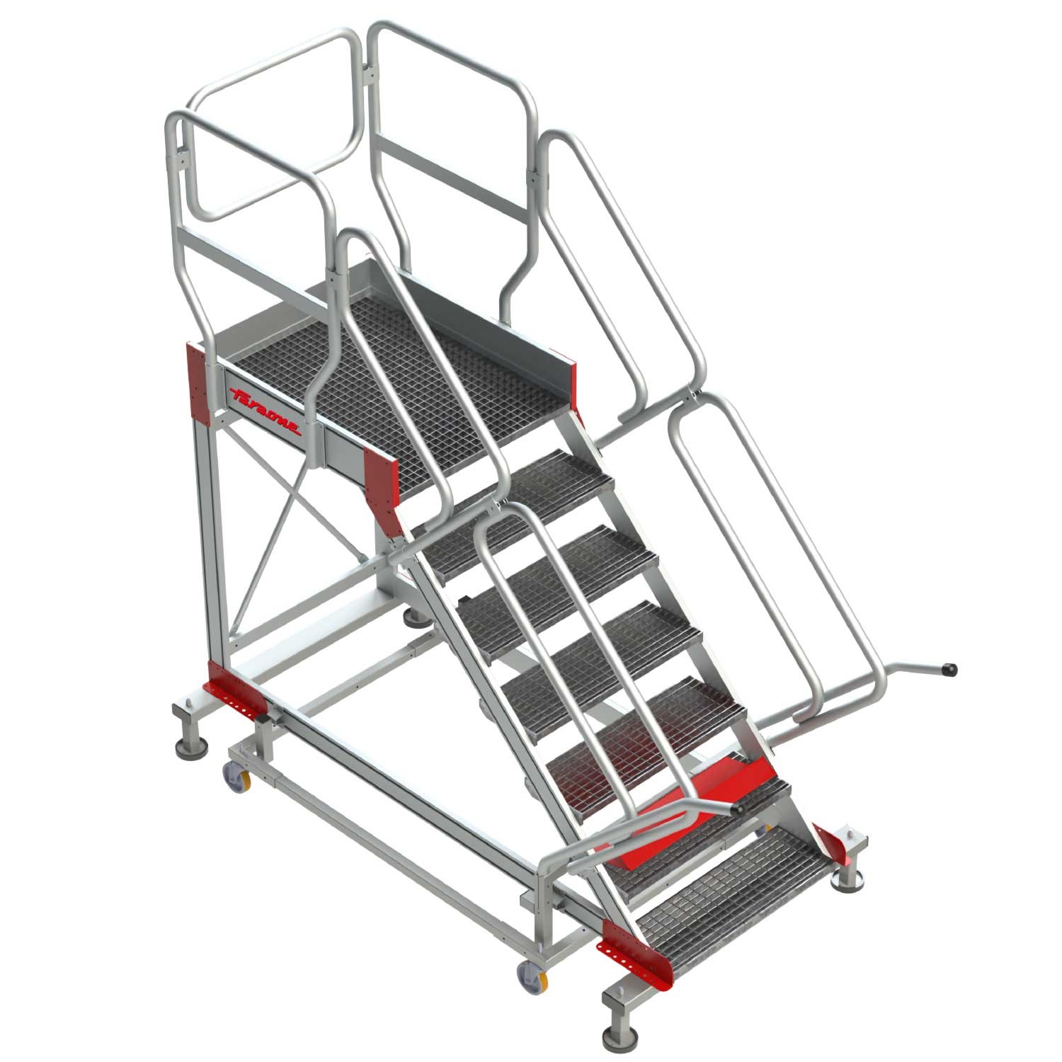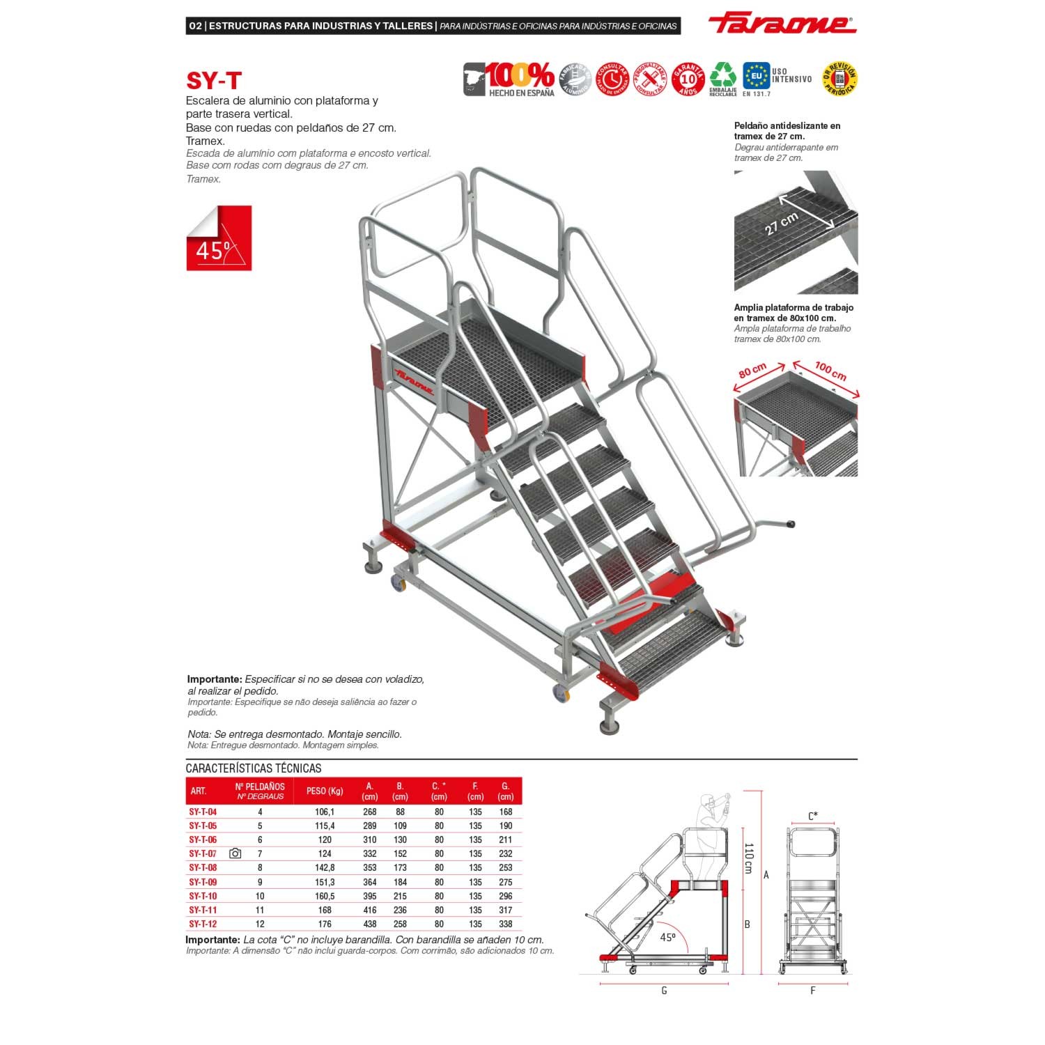 A SY-T é uma escada com rodas e com uma ampla superfície de trabalho antiderrapante de 85x100 cm, com acesso através de uma escada inclinada a 45°, com degraus antiderrapantes de 27 cm de profundidade e corrimão em ambos os lados.