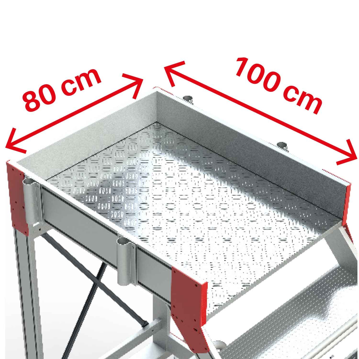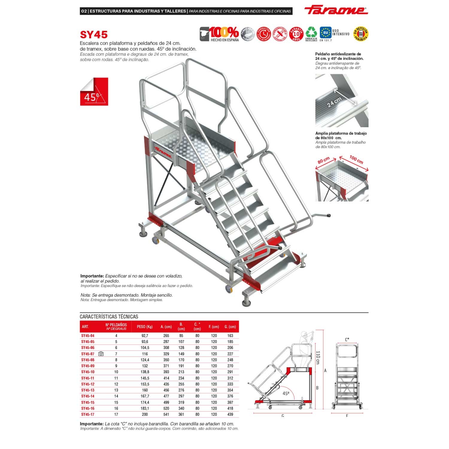 A SY45 é uma escada com rodas e com uma ampla superfície de trabalho antiderrapante de 80x100 cm, com acesso através de uma escada inclinada a 45°, com degraus antiderrapantes de 24 cm de profundidade e corrimão em ambos os lados.