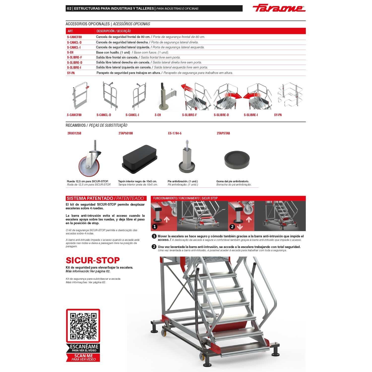 Inclui o sistema SICUR STOP patenteado; kit de segurança que permite deslocar a escada sobre as quatro rodas. A barra anti-intrusão impede o acesso quando a escada está apoiada nas rodas e deixa a passagem livre na posição de paragem "stop".
