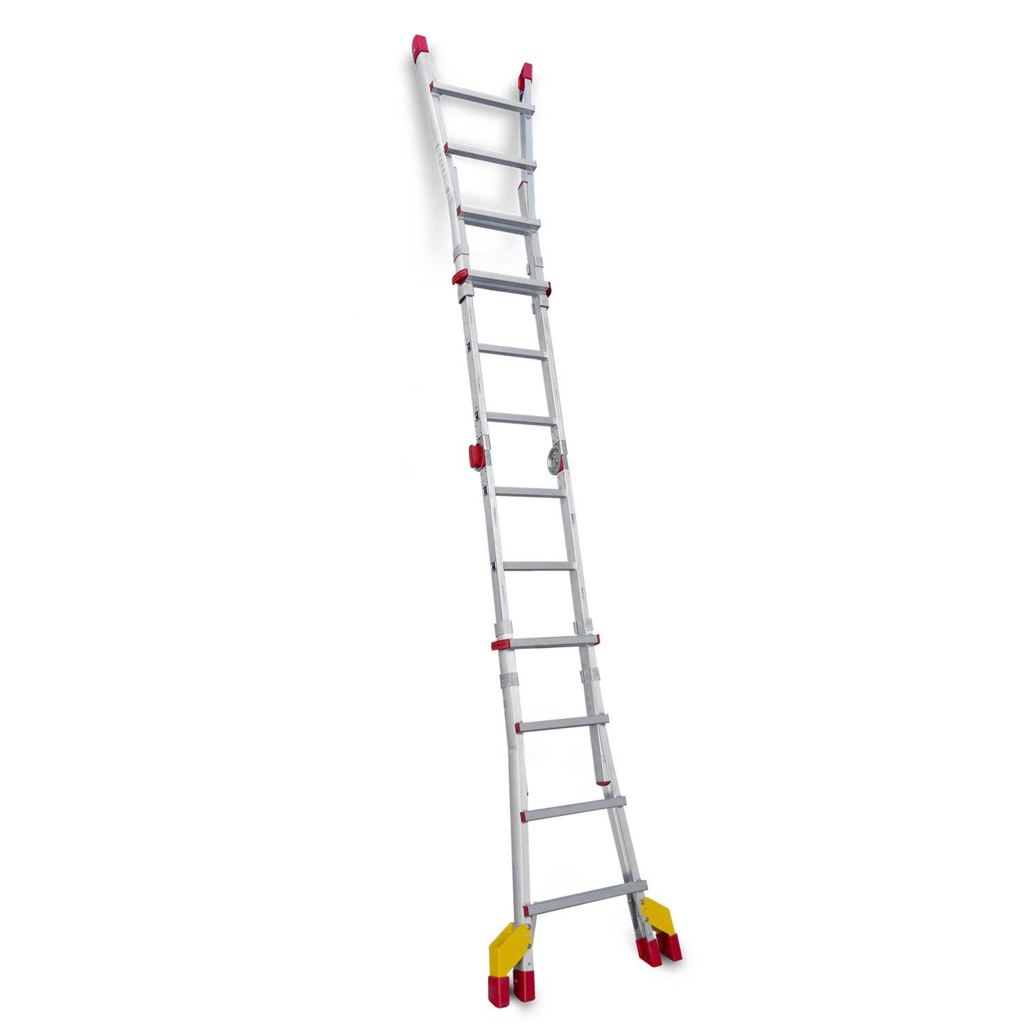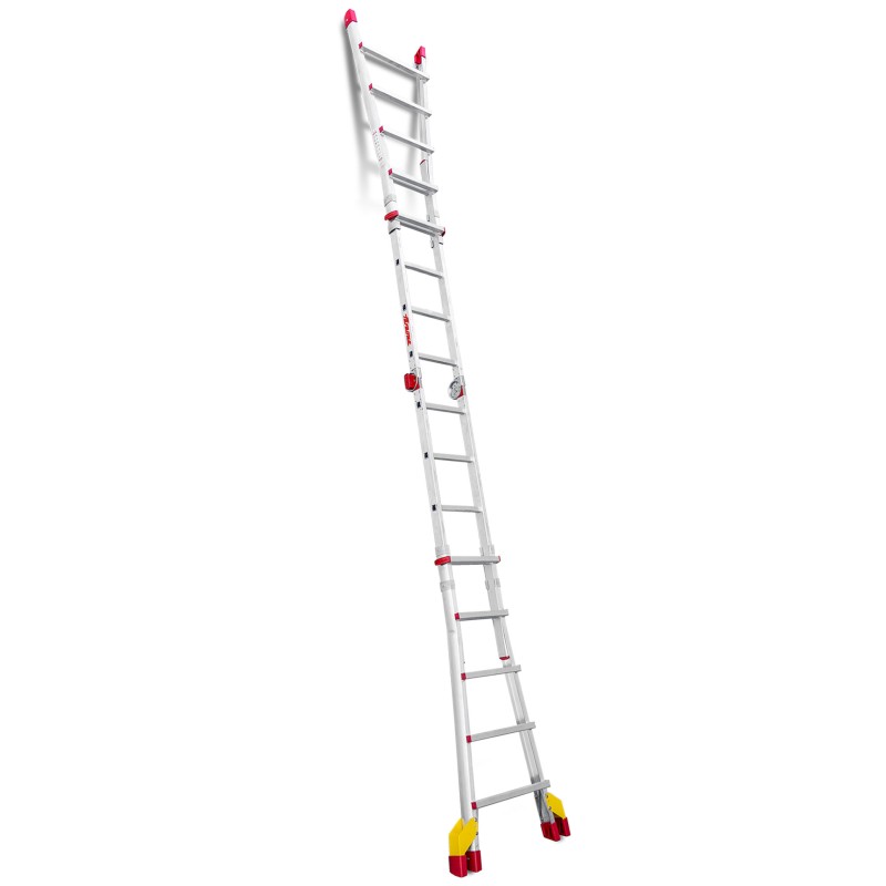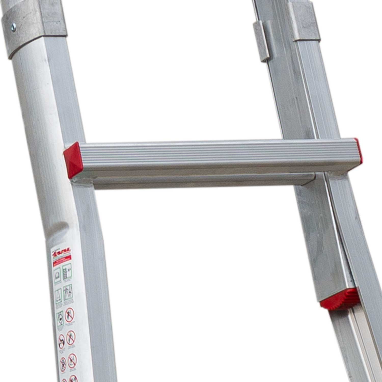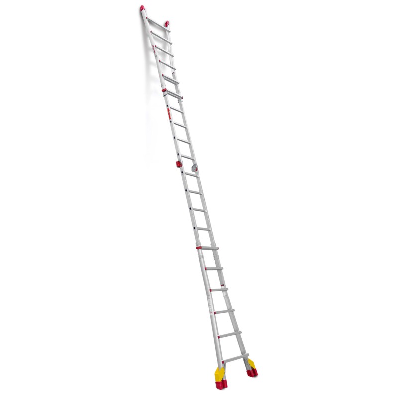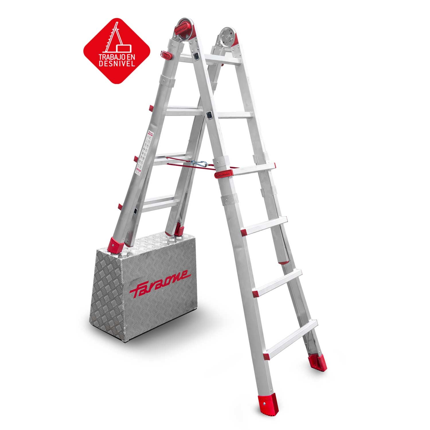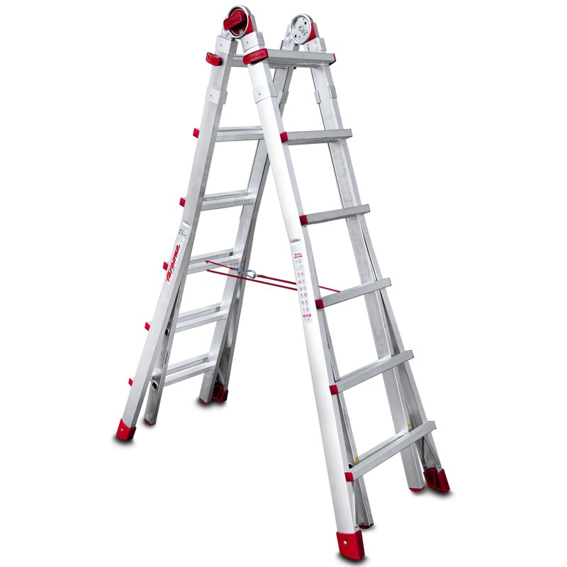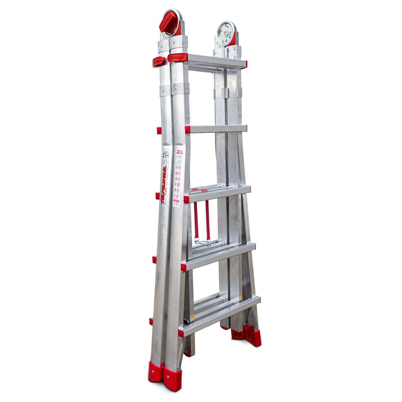 A escada TELES é fabricada em alumínio, com degraus antiderrapantes com 3 cm, altura ajustável e calços de grande aderência. Inclui de série os estabilizadores extraíveis, necessários para cumprir as normas com a escada estendida.