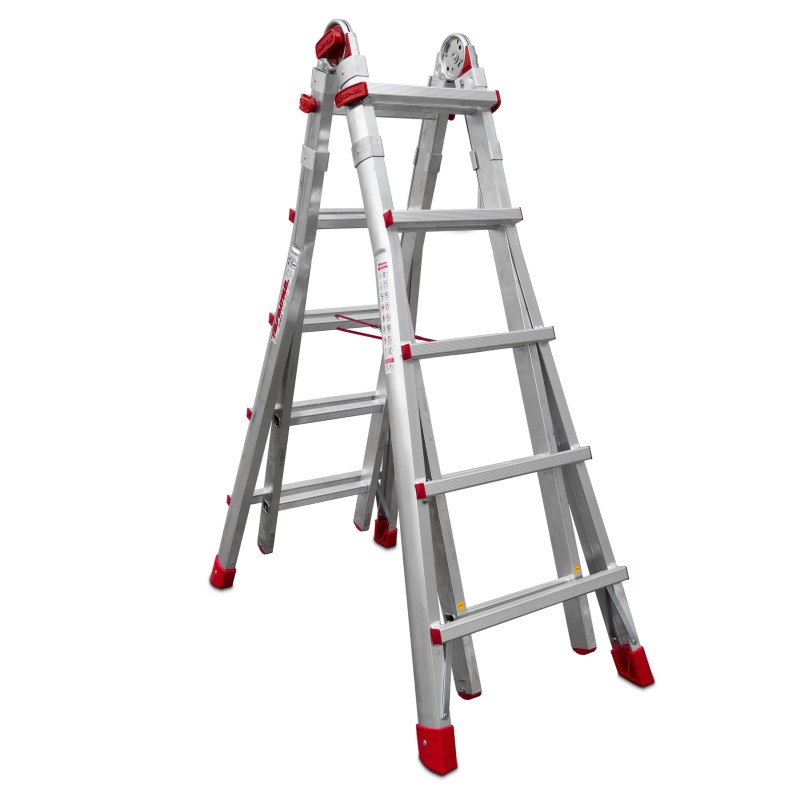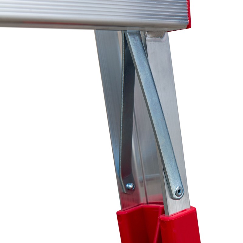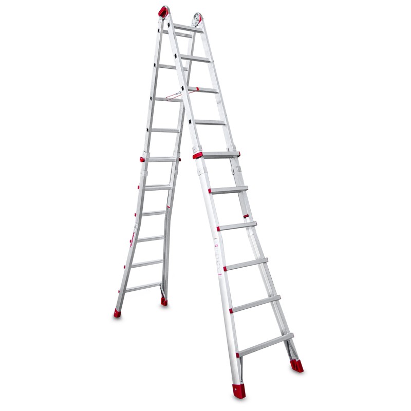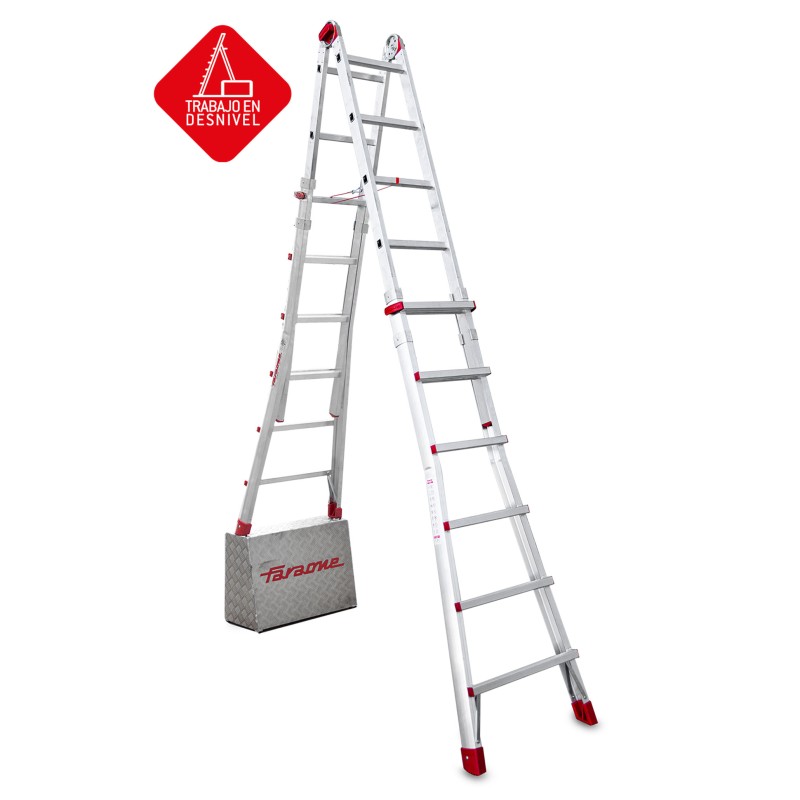 Para regular a altura, dispõe de um punho de segurança ergonómico para engatar/desengatar e alongar a escada. Conta ainda com um gradil opcional para utilizar os dois últimos degraus em posição de tesoura. Ver BRA-TELES opcional.