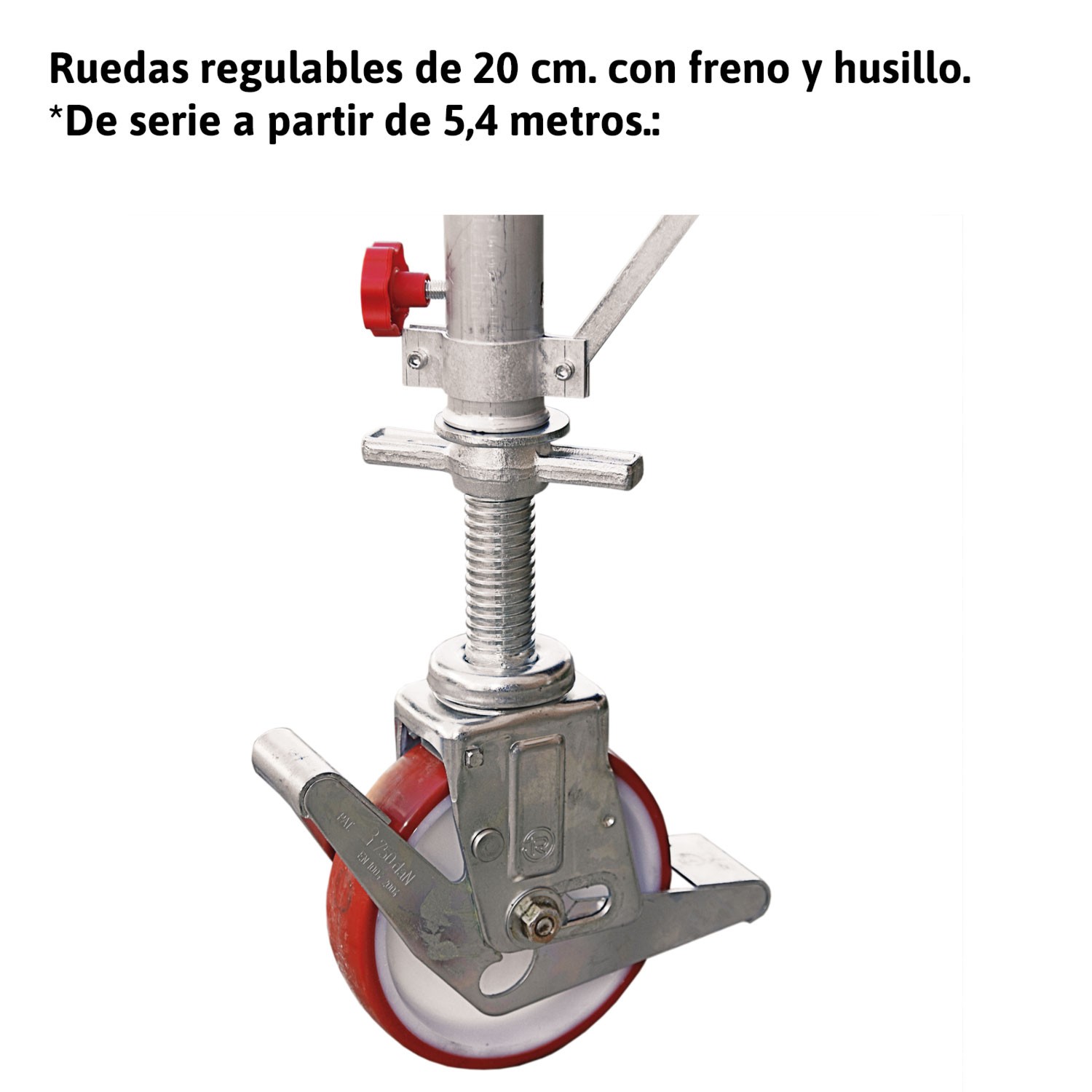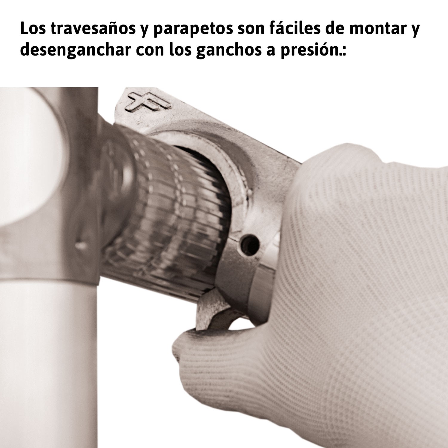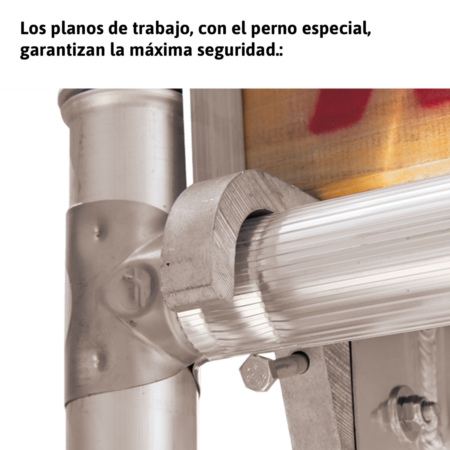 Plataformas de trabalho realizadas com estrutura de alumínio de alta resistência e grandes ganchos de suporte em alumínio que lhes permitem resistir a choques acidentais. Rodapé de alumínio e tampo em contraplacado com tratamento fenólico para resistência à água.