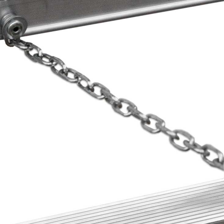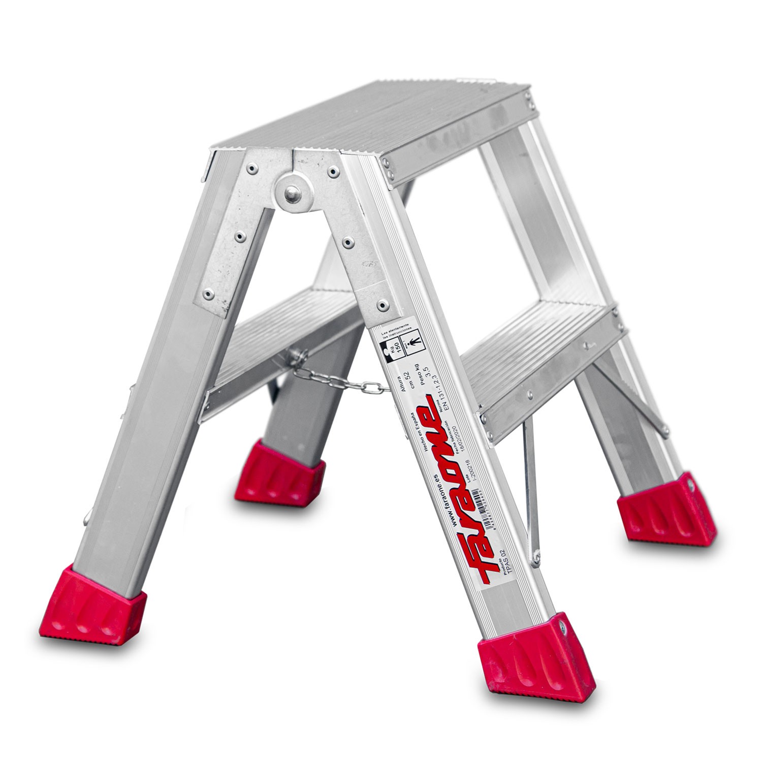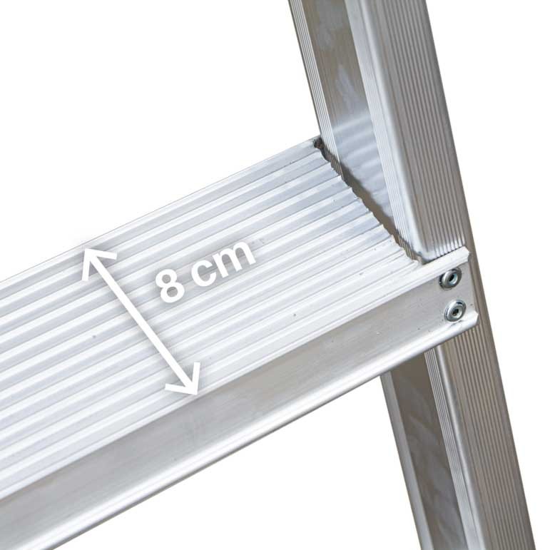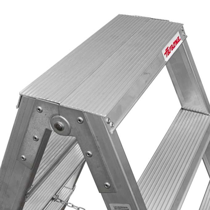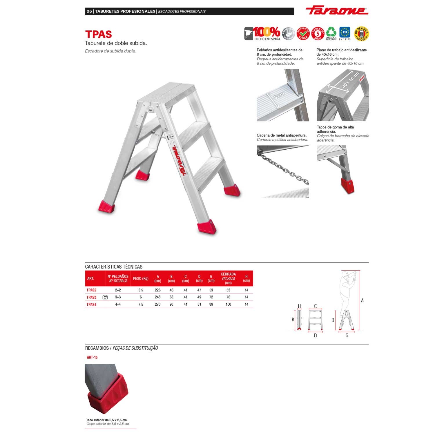 O modelo TPAS é fabricado em alumínio, possui um sistema de dobradiças rígido e resistente entre os dois lanços de subida, um sistema antifecho seguro, degraus com 8 cm e grandes calços de borracha com grande aderência à superfície.