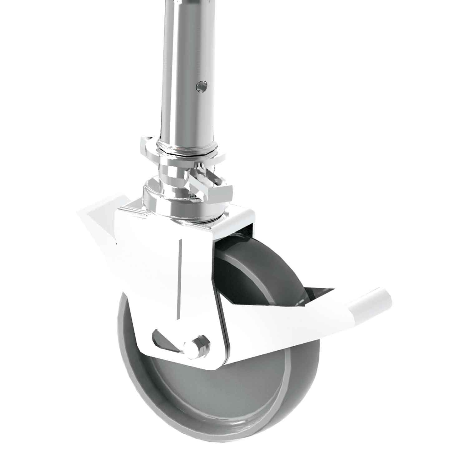 Rodas giratórias de 200 mm com travão, ajustáveis em altura.