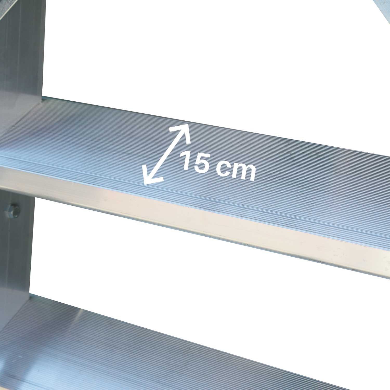 Acesso seguro à plataforma através de uma escada com inclinação de 60º e degraus antiderrapantes com 15 cm de profundidade.