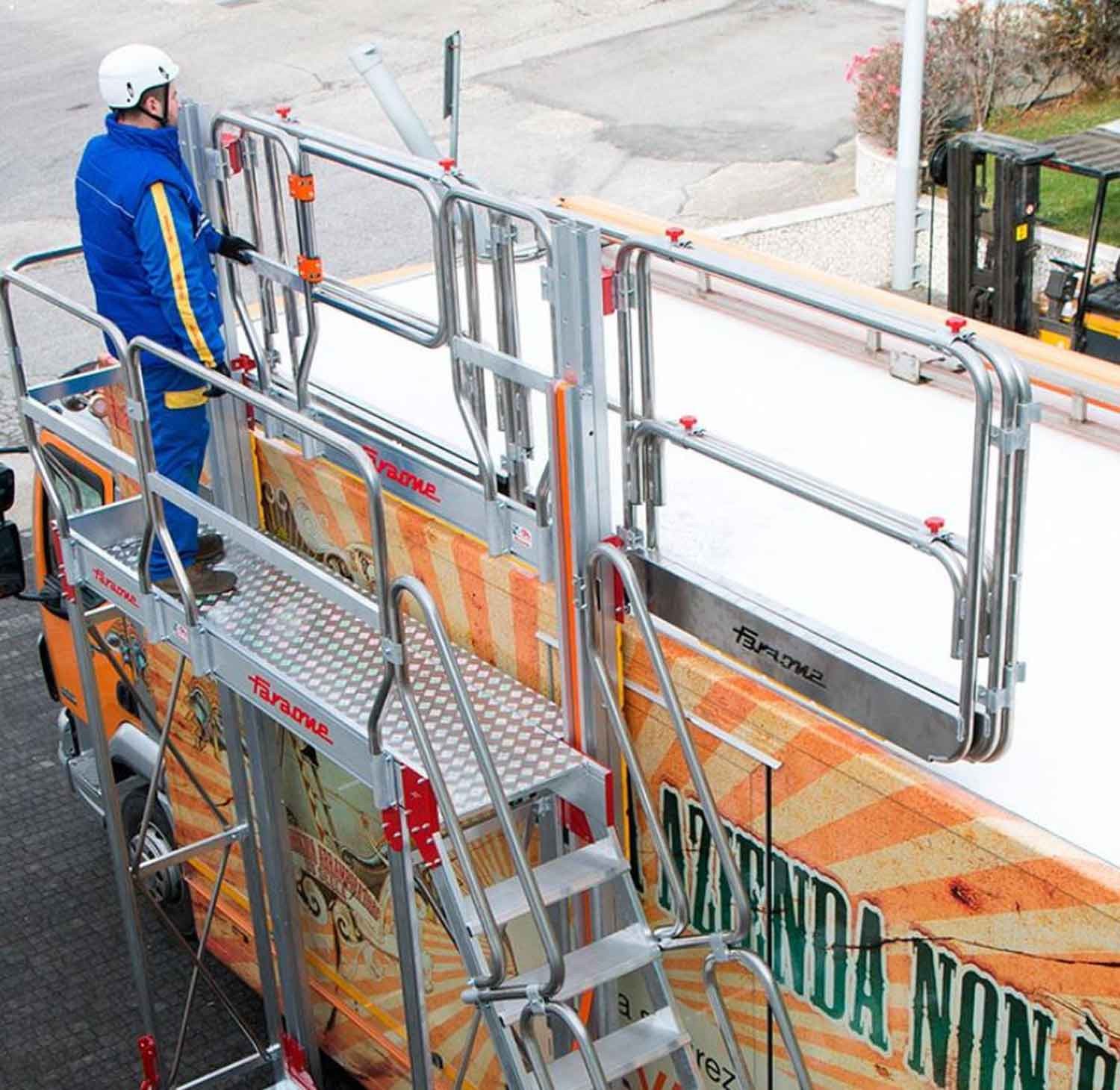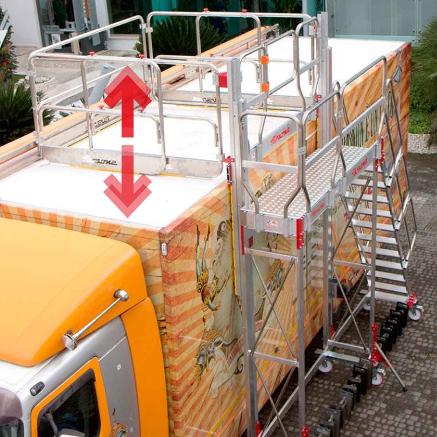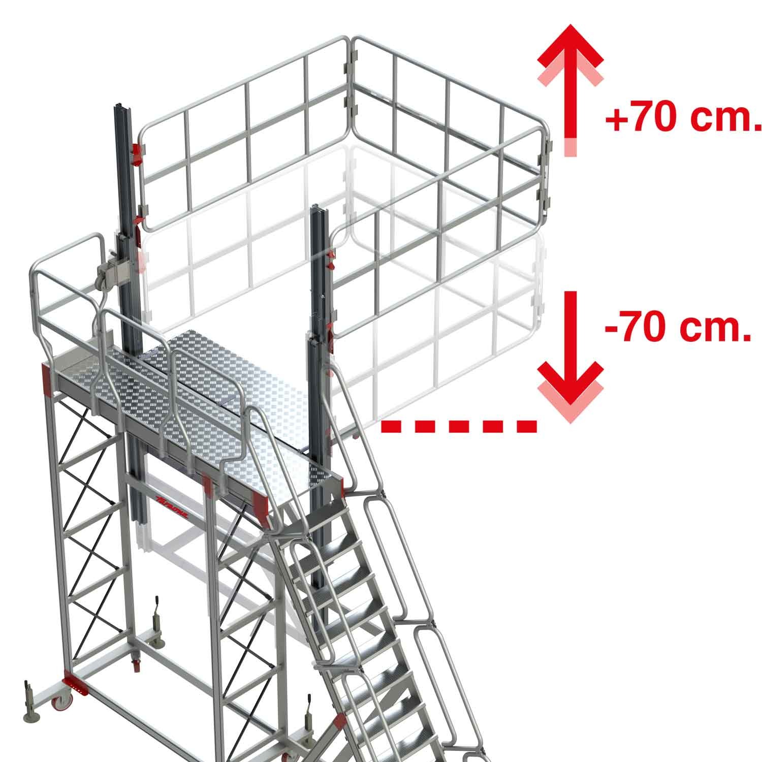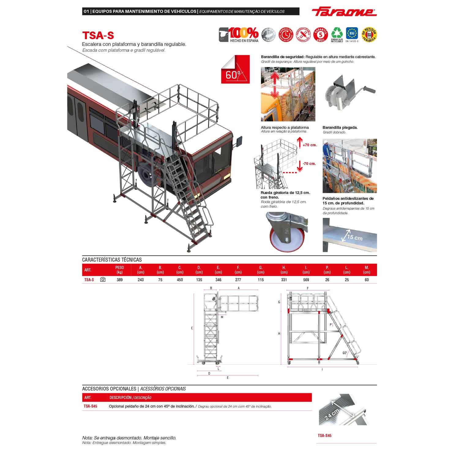 A TSA-S é uma escada com plataforma e sistema de gradis de proteção ajustável em altura através de um sistema de roldanas, concebida para realizar trabalhos de manutenção em veículos de grandes dimensões, cisternas, silos, etc.