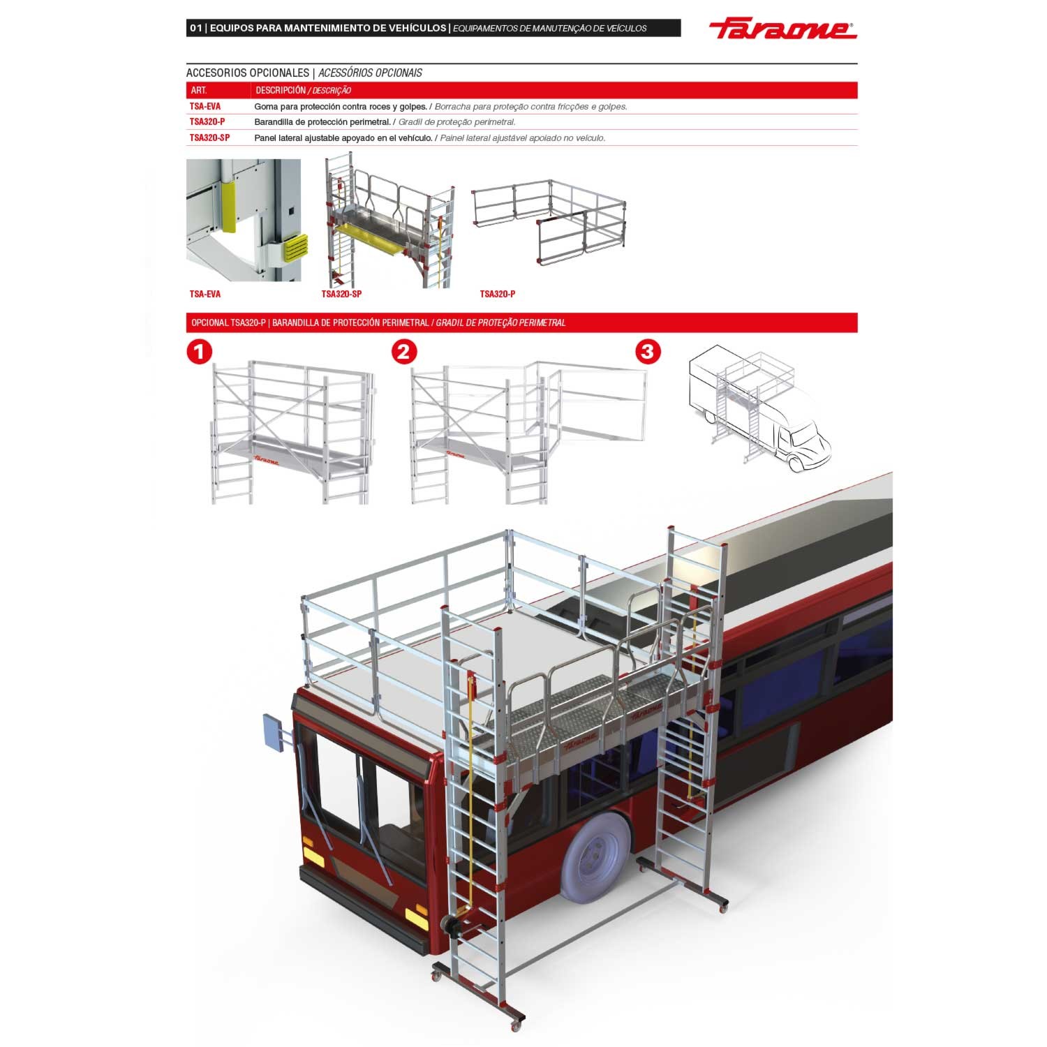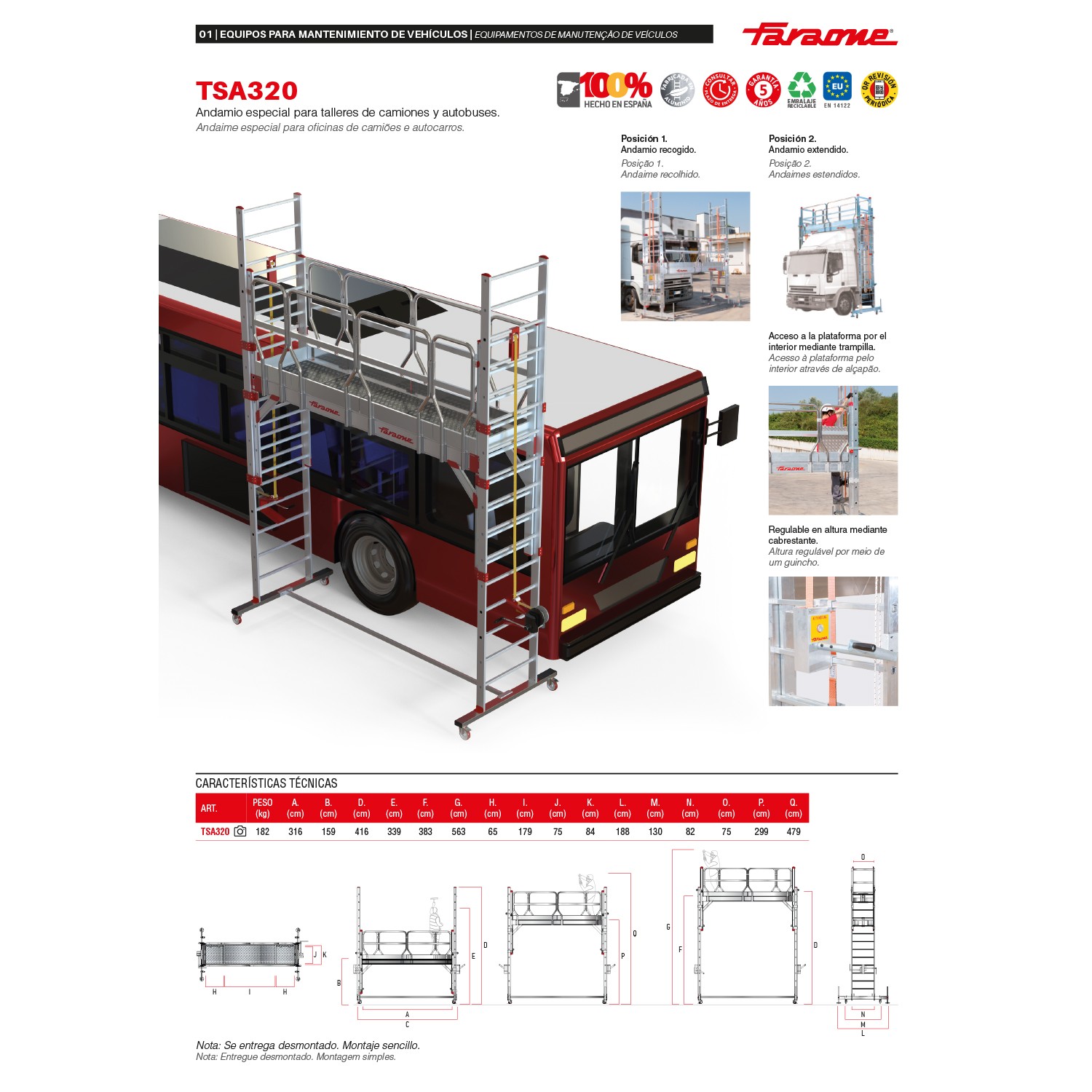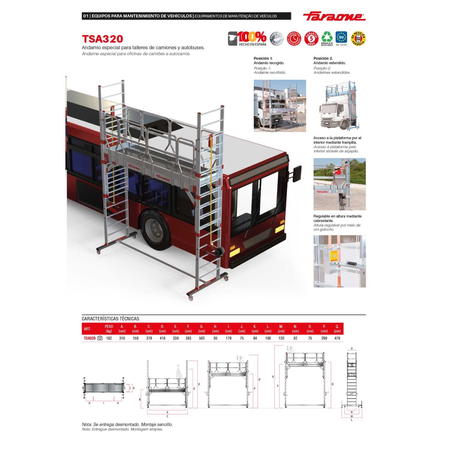 O TSA 320 é um andaime de altura ajustável com dois guinchos, concebido para efetuar a manutenção de camiões e autocarros.
